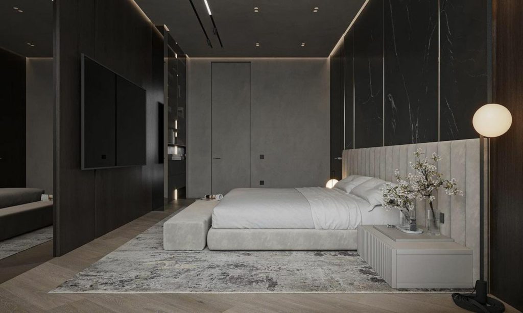 - Tworzenie klimatycznych wnętrz – aranżacja ciemnego wnętrza sprzyja budowaniu nastrojowej atmosfery, co jest szczególnie pożądane w miejscach przeznaczonych do relaksu, takich jak sypialnia czy salon. Ciemna ściana w sypialni dodaje przestrzeni przytulności i intymności.