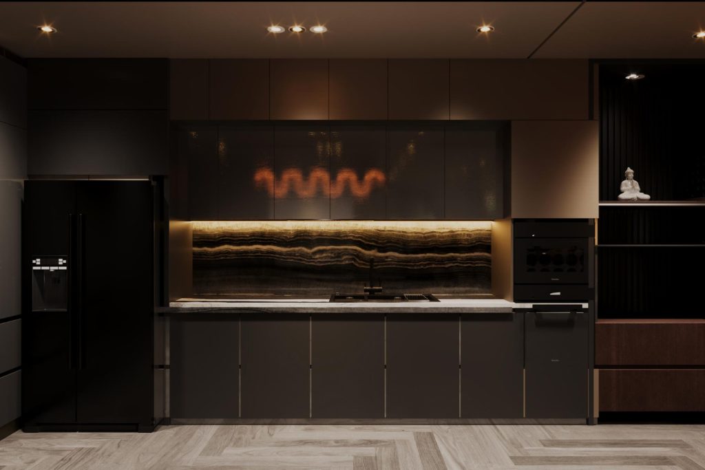 Głębokie odcienie, takie jak granat, antracyt czy ciemna zieleń, dodają elegancji i tworzą wrażenie uporządkowanej, stylowej przestrzeni. Ciemne fronty szafek czy blat w odcieniu grafitu świetnie maskują drobne zabrudzenia i smugi, co sprawia, że kuchnia wygląda estetycznie przez dłuższy czas. W odpowiednio oświetlonej aranżacji ciemnego wnętrza uzyskujemy nowoczesny, luksusowy efekt.