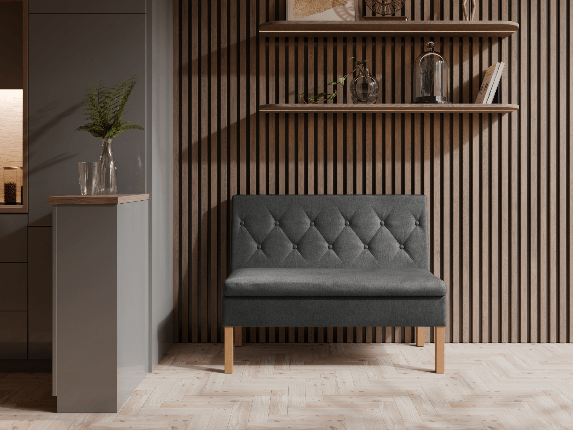 Komfort użytkowania zapewnia wysokiej jakości pianka T30, która gwarantuje trwałość i wygodę na lata. Ławka Praga to także mebel wolnostojący — tył został starannie obity tkaniną, co pozwala ustawić ją w dowolnym miejscu w pomieszczeniu. Do wyboru masz szeroką gamę kolorystyczną oraz możliwość personalizacji — możesz samodzielnie wybrać kolor nóg, co ułatwia dopasowanie ławki do wystroju wnętrza.