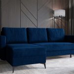 Jego głęboki, granatowy kolor wprowadza do salonu atmosferę elegancji i spokoju. To barwa, która doskonale odnajduje się zarówno w nowoczesnych, jak i klasycznych aranżacjach. Dzięki temu mebel staje się uniwersalną bazą dla wielu stylów. Welurowa tapicerka Manila pięknie podkreśla nasycony odcień, a wysokie, czarne nóżki dodają konstrukcji wizualnej lekkości. Co ważne, tapicerowany tył pozwala na ustawienie narożnika w dowolnym miejscu. Może on stać na środku pokoju, subtelnie dzieląc przestrzeń.