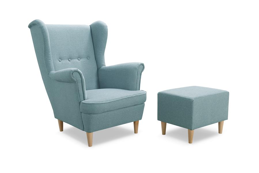 Miętowy fotel Uszak z dopasowaną pufą wnosi do wnętrza ponadczasową elegancję i powiew świeżości.