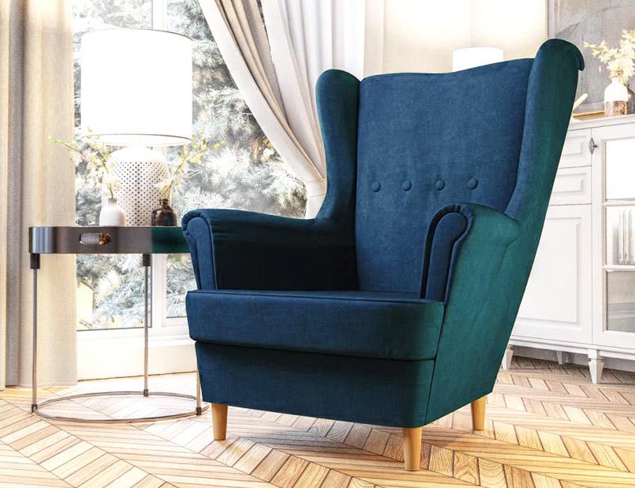 Jego ponadczasowy kształt opiera się na wysokich nogach w kolorze naturalnego buku. Wprowadza do wnętrza klimat skandynawskiej prostoty i klasycznej elegancji. Głęboki granatowy odcień tapicerki nadaje mu wyrazistego charakteru. Dzięki temu fotel staje się stylowym akcentem, który buduje przytulną i wysmakowaną atmosferę w salonie. Co ważne, jego tył jest w całości obity tkaniną. Pozwala to na ustawienie mebla w dowolnym miejscu, nie tylko przy ścianie.