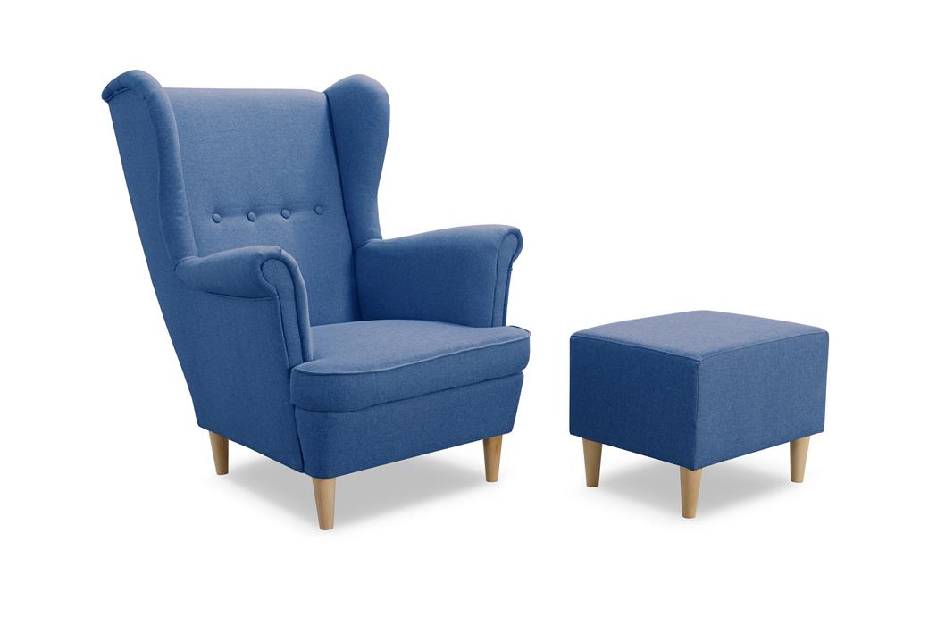 Klasyczny fotel Uszak w komplecie z pufą otula głębokim, niebieskim kolorem.