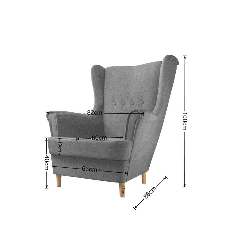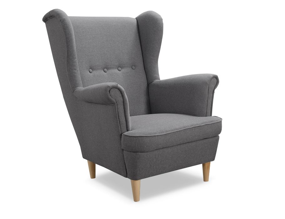 Jego charakterystyczna sylwetka z wysokim oparciem i subtelnymi „”uszami”” tworzy we wnętrzu niezwykle przytulny klimat. Całość wspiera się na wysokich, drewnianych nóżkach w kolorze buku, które dodają konstrukcji wizualnej lekkości. Szlachetny odcień szarości wprowadza do aranżacji spokój oraz subtelną elegancję. Dlatego fotel świetnie odnajduje się w przestrzeniach urządzonych w stylu skandynawskim lub klasycznym.