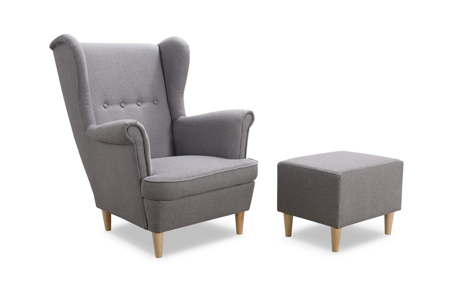 Jasnoszary fotel Uszak z pufą wprowadza do wnętrza ponadczasową elegancję w skandynawskim stylu.