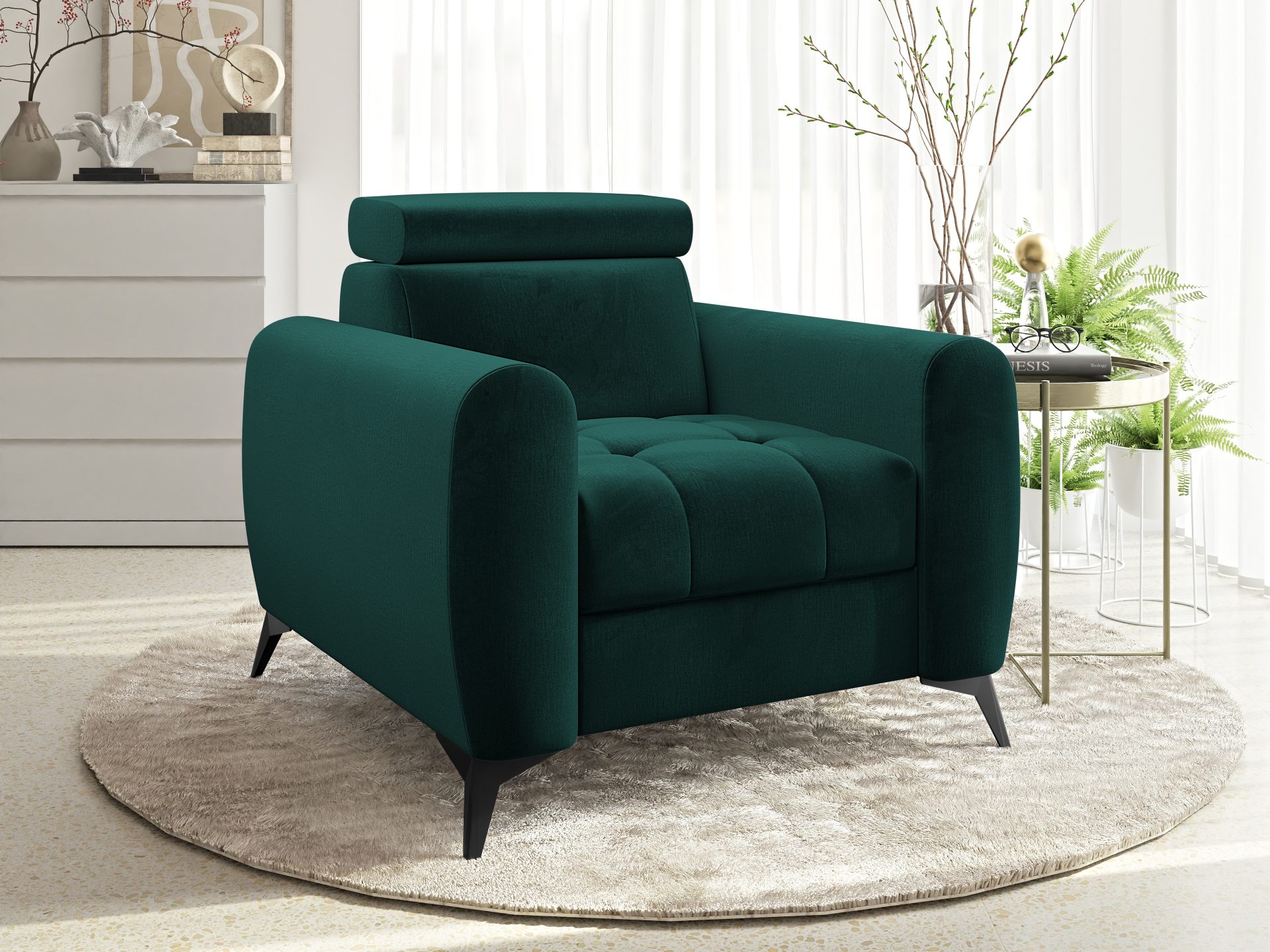 Oto fotel Bjorn otulony welurem w głębokim odcieniu butelkowej zieleni.