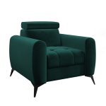 Jego nowoczesna forma subtelnie nawiązuje do stylu boho. Wysokie, czarne nóżki dodają sylwetce lekkości i ułatwiają utrzymanie porządku pod meblem. Kolor butelkowej zieleni wnosi do wnętrza spokój i odrobinę elegancji. Dlatego fotel doskonale prezentuje się w otoczeniu naturalnego drewna oraz domowych roślin. Co ważne, tapicerowany tył pozwala na ustawienie go w dowolnym miejscu salonu. W ten sposób staje się on centralnym punktem aranżacji lub dyskretnym uzupełnieniem strefy wypoczynku.