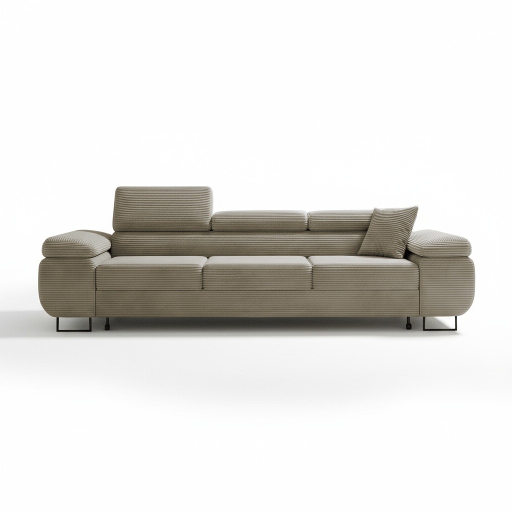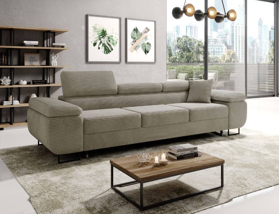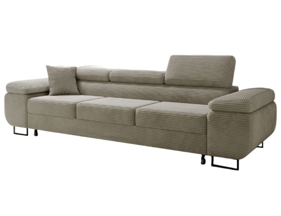Kanapa Astorp została stworzona z myślą o codziennym komforcie. Regulowane zagłówki umożliwiają idealne dopasowanie podparcia do własnych potrzeb. Można wygodnie oprzeć głowę podczas czytania książki lub wieczornego seansu filmowego. Siedzisko wypełnione sprężynami falistymi oraz pianką zapewnia stabilne i elastyczne podparcie dla całego ciała. W razie potrzeby kanapę można błyskawicznie zmienić w dodatkowe miejsce do spania. Rozkładanie za pomocą automatu Delfin jest proste i nie wymaga wysiłku.