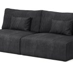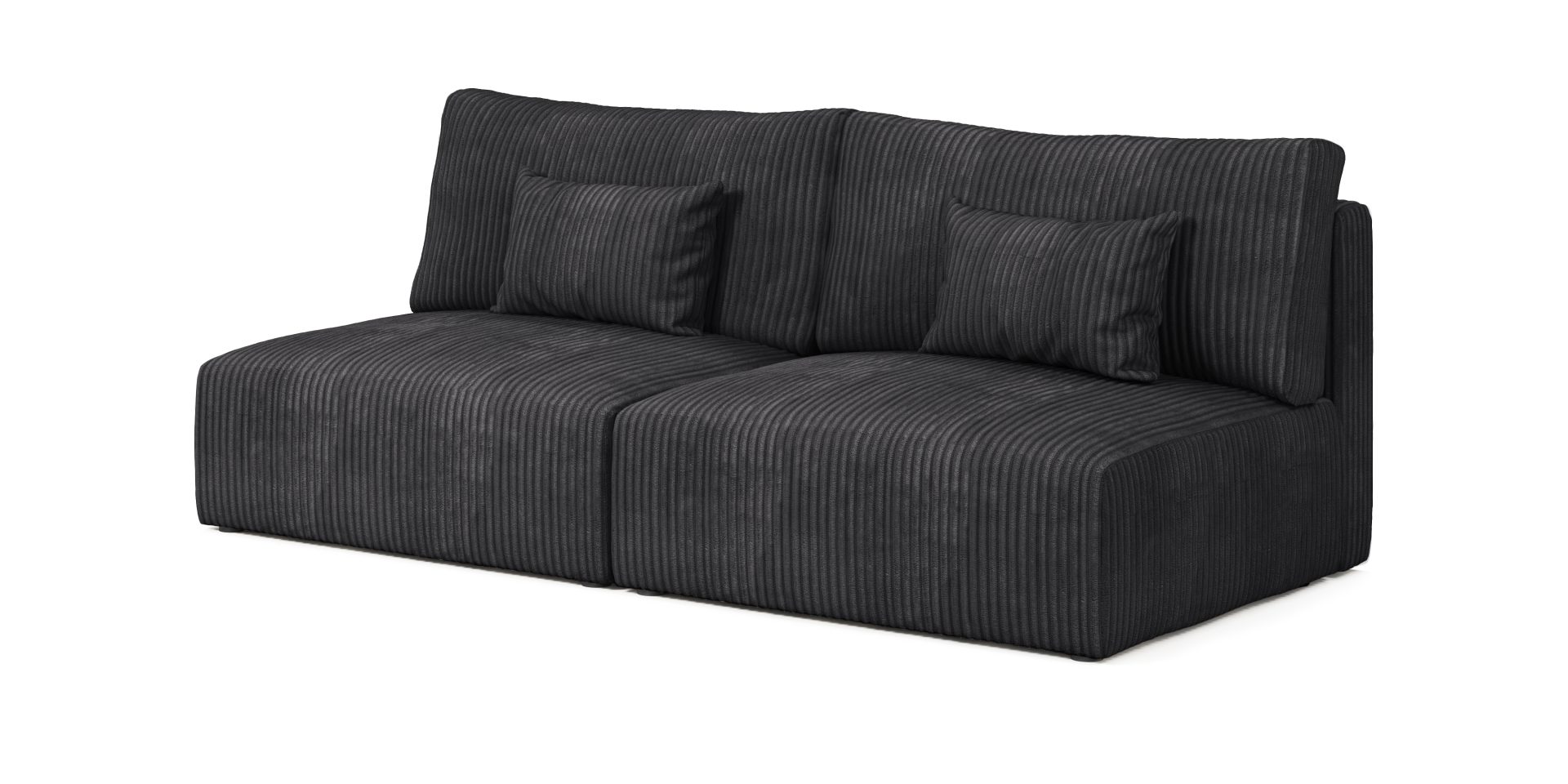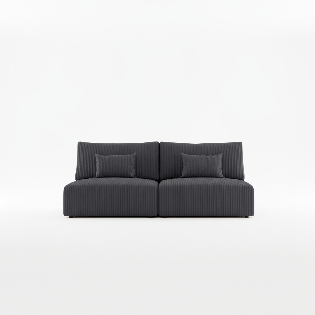 Jej prosta, geometryczna bryła doskonale wpisuje się w minimalistyczne aranżacje. Głęboki grafitowy odcień tkaniny nadaje meblowi szlachetnego charakteru. Dzięki temu staje się on wyrazistym akcentem lub elegancką bazą dla kolorowych dodatków. Mięsisty sztruks o wyczuwalnej fakturze dodaje całości przytulności i wizualnej głębi. Co ważne, tapicerowany tył pozwala na dowolne ustawienie kanapy w salonie. Nie musi ona stać pod ścianą, co daje dużą swobodę aranżacyjną.