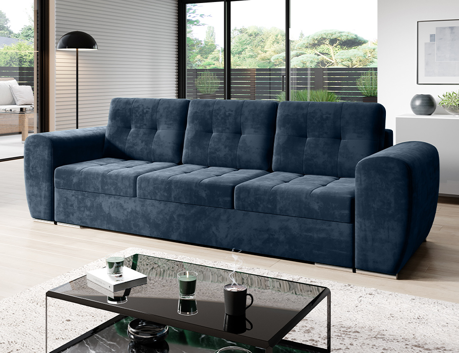 Prosta bryła osadzona na niskich, chromowanych nóżkach dobrze komponuje się zarówno z nowoczesnymi, jak i tradycyjnymi aranżacjami. Głęboki, granatowy odcień tkaniny nadaje wnętrzu szlachetny i spokojny charakter. Dlatego kanapa staje się eleganckim centrum salonu. Co ważne, tapicerowany tył mebla pozwala na dowolne ustawienie go w otwartej przestrzeni dziennej.