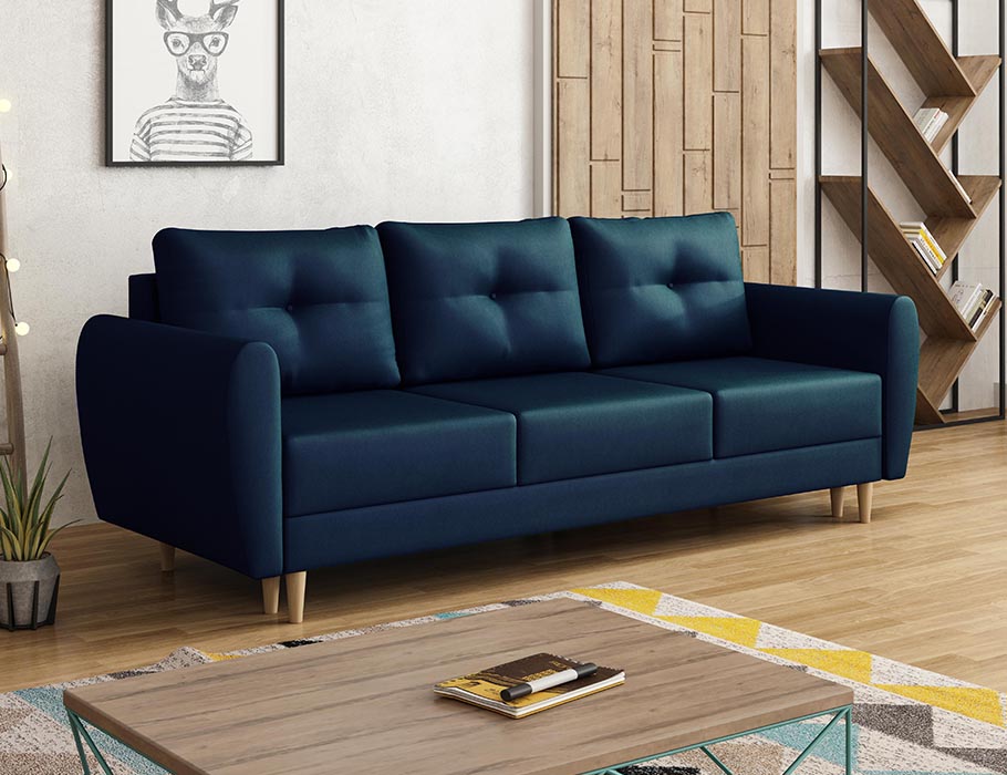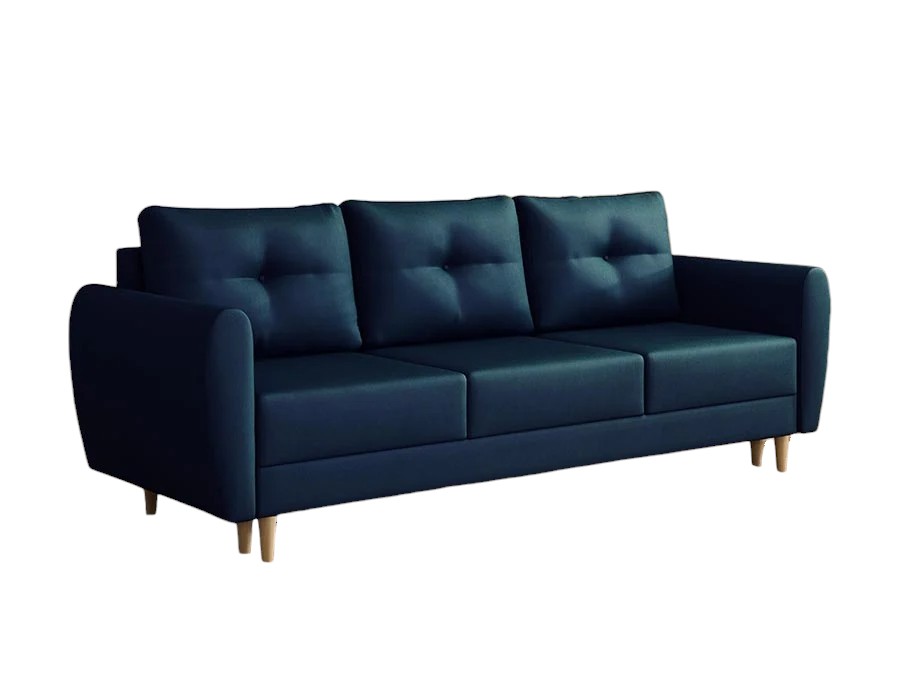 Głęboki, granatowy kolor tapicerki nadaje wnętrzu szlachetny i spokojny charakter. Taka barwa staje się wyrazistym akcentem lub stonowaną bazą dla przytulnego salonu. Dzięki temu kanapa świetnie komponuje się z naturalnym drewnem, metalicznymi dodatkami oraz jasnymi ścianami. Co ważne, tapicerowany tył mebla pozwala na dowolne ustawienie go w pomieszczeniu. Można go umieścić nawet na środku salonu, tworząc funkcjonalne strefy wypoczynku.