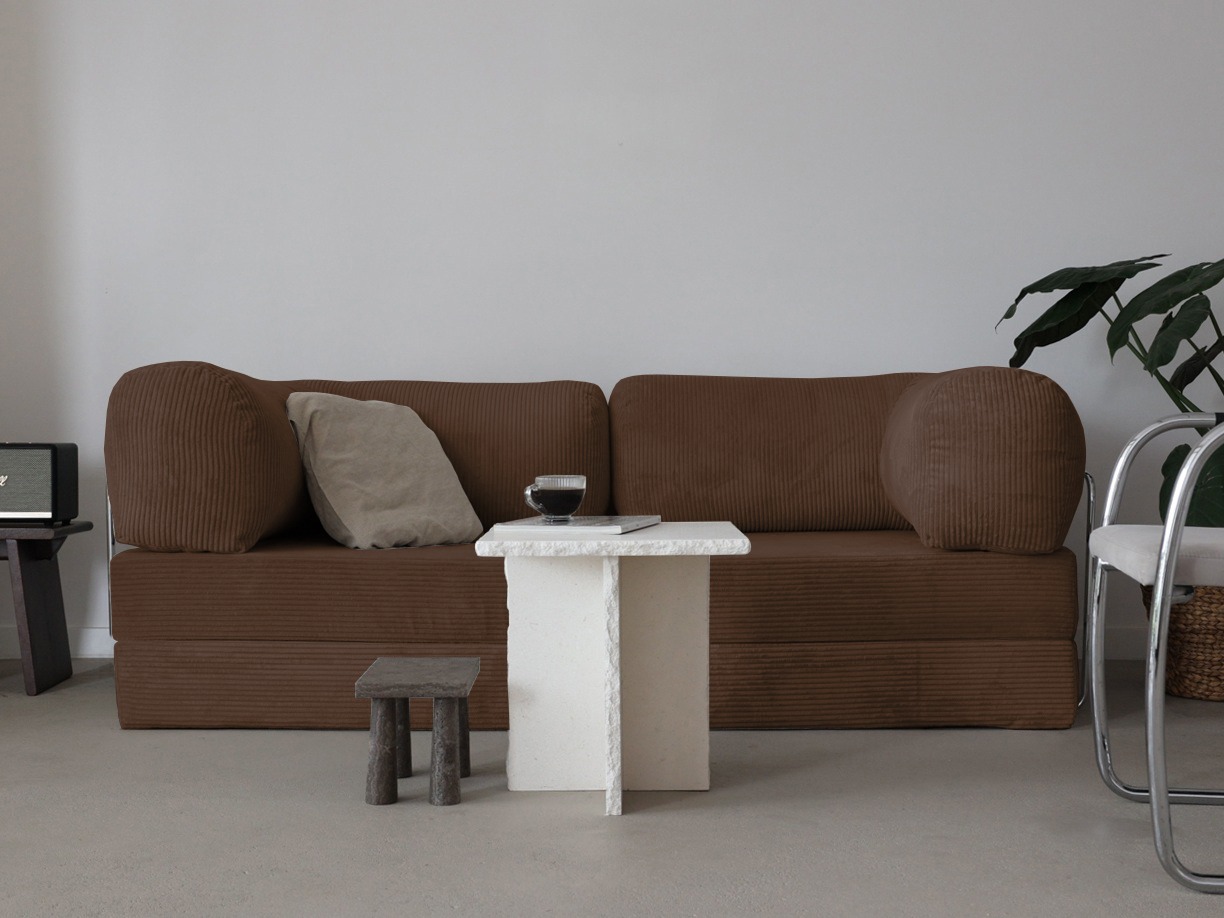 Rozkładana sofa podłogowa/futon łączy wygodę i oszczędność miejsca. Tapicerka sztruksowa jest miękka w dotyku, a jednocześnie odporna na codzienne użytkowanie. Dwie duże poduchy tworzą narożne oparcie, które sprawdza się zarówno do czytania, jak i oglądania filmów. Po rozłożeniu otrzymujesz płaską, równą powierzchnię spania – świetną dla gości lub popołudniowej drzemki. Boczne stalowe uchwyty stabilizują konstrukcję, a prosta budowa umożliwia szybkie składanie i przechowywanie. To idealny wybór do małych mieszkań, kawalerek i nowoczesnych aranżacji typu „compact living”.