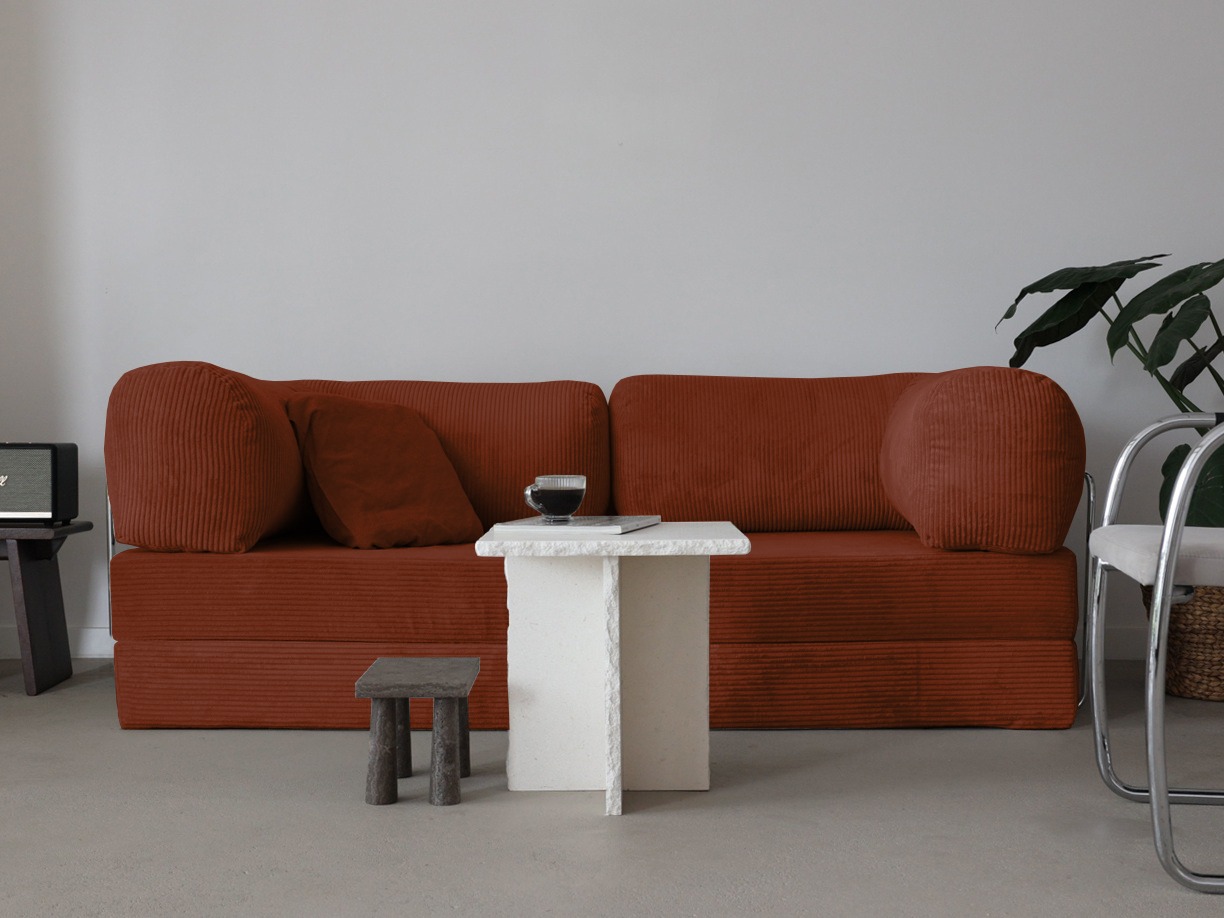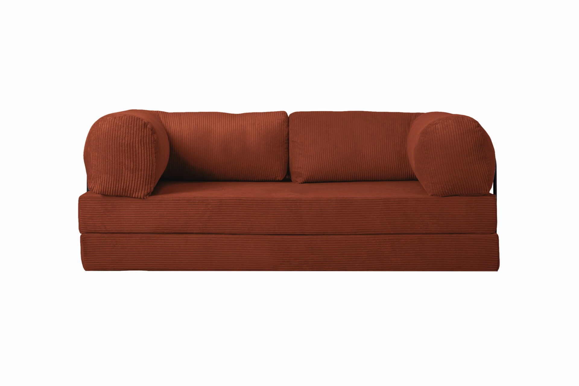 Rozkładana sofa podłogowa/futon łączy wygodę i oszczędność miejsca. Tapicerka sztruksowa jest miękka w dotyku, a jednocześnie odporna na codzienne użytkowanie. Dwie duże poduchy tworzą narożne oparcie, które sprawdza się zarówno do czytania, jak i oglądania filmów. Po rozłożeniu otrzymujesz płaską, równą powierzchnię spania – świetną dla gości lub popołudniowej drzemki. Boczne stalowe uchwyty stabilizują konstrukcję, a prosta budowa umożliwia szybkie składanie i przechowywanie. To idealny wybór do małych mieszkań, kawalerek i nowoczesnych aranżacji typu „compact living”.