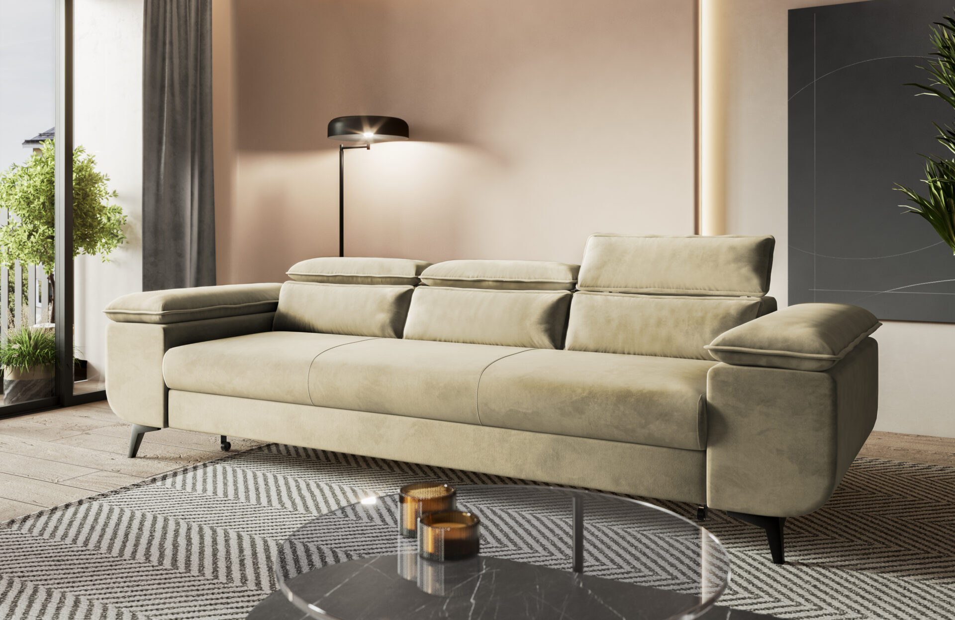 Beżowa kanapa Flat to propozycja o nowoczesnej, eleganckiej linii i miękkim welurowym obiciu. Łączy w sobie styl, komfort i funkcjonalność, tworząc idealne miejsce do codziennego wypoczynku.
