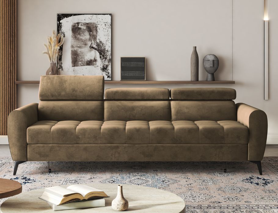 Wygodne siedzisko ze sprężynami falistymi zaprasza do odpoczynku po długim dniu. Zapewnia ono sprężystość i stabilne podparcie dla ciała. Co ważne, kanapa posiada regulowane zagłówki. Pozwalają one dostosować wysokość oparcia do indywidualnych potrzeb. Dzięki temu wieczorny seans filmowy lub czytanie książki stają się jeszcze przyjemniejsze.