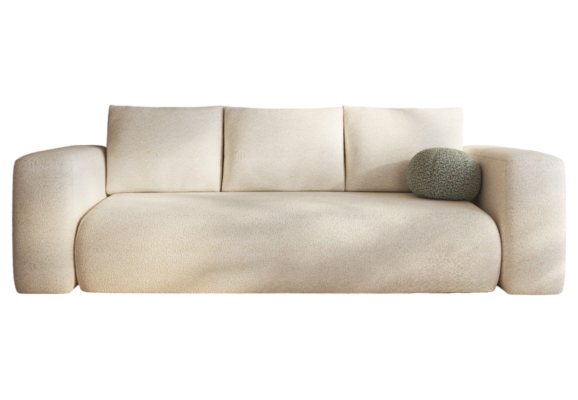 Wyjątkowa tkanina boucle ma charakterystyczną pętelkową fakturę, która jest niezwykle przyjemna w dotyku. Materiał jest przyjazny zwierzętom, więc nie trzeba martwić się o zaciągnięcia. Co więcej, utrudnia on wchłanianie płynów, dzięki czemu łatwo usunąć przypadkowe zabrudzenia. Dzięki temu ciemnokremowa kanapa Lambi zachwyca swoim wyglądem przez długi czas, nawet w domu pełnym życia.