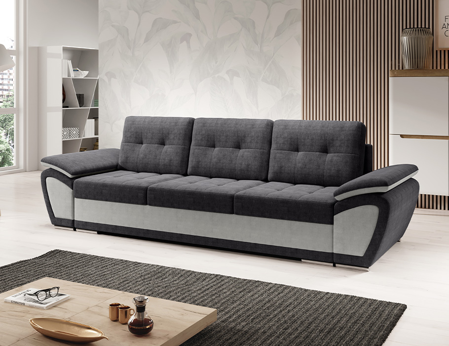 Kanapa Enzo jest także niezwykle praktyczna. Posiada funkcję spania, idealną dla nocujących gości. Rozkładanie za pomocą automatu DL jest szybkie i nie wymaga wysiłku. Pod siedziskiem znajduje się duży pojemnik na pościel. Dzięki temu dodatkowe koce i poduszki są zawsze pod ręką, a salon pozostaje uporządkowany.