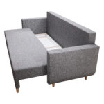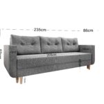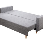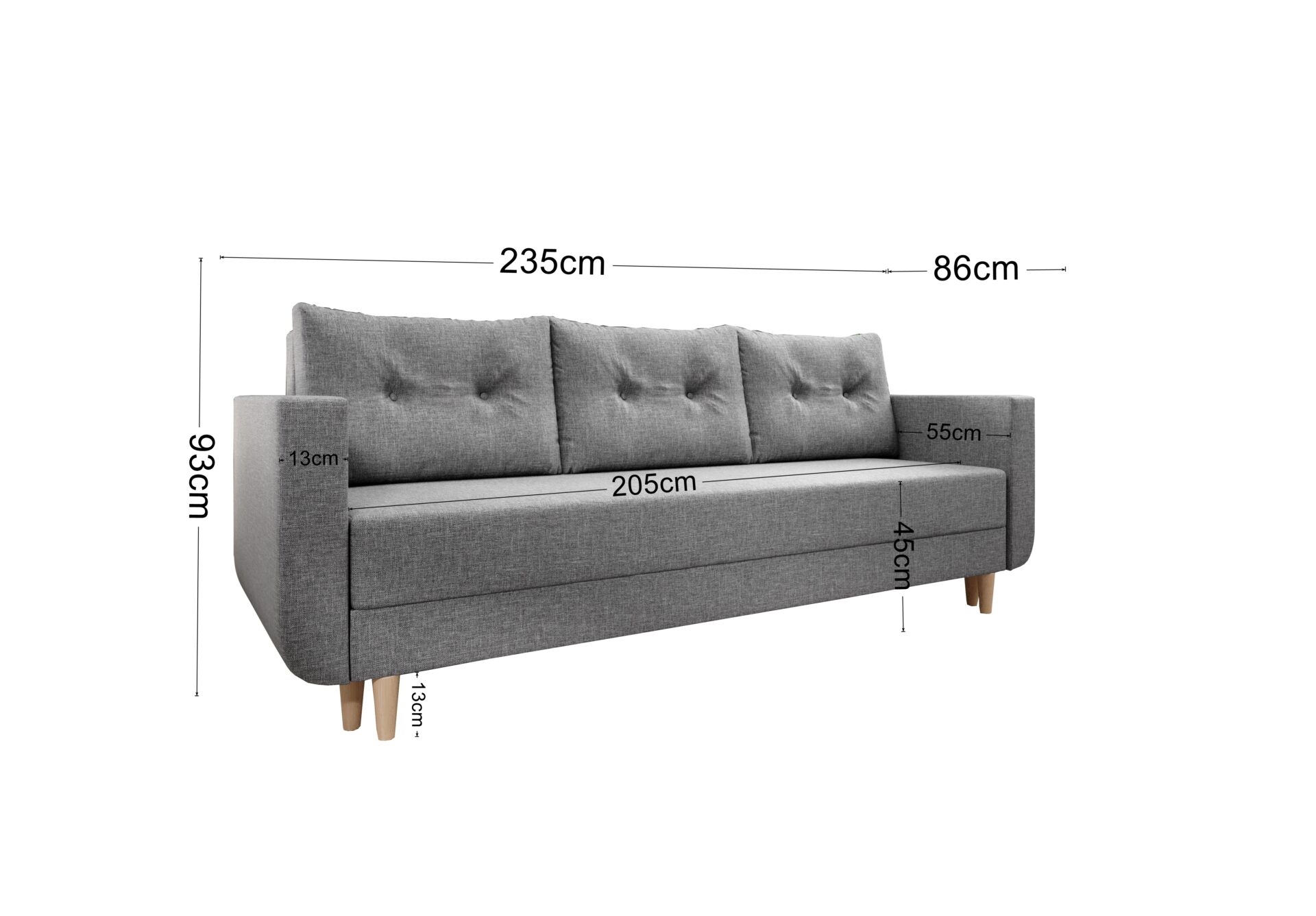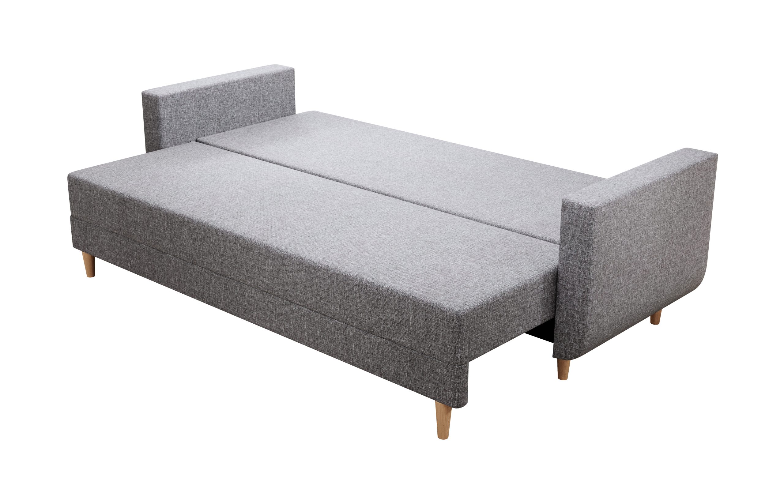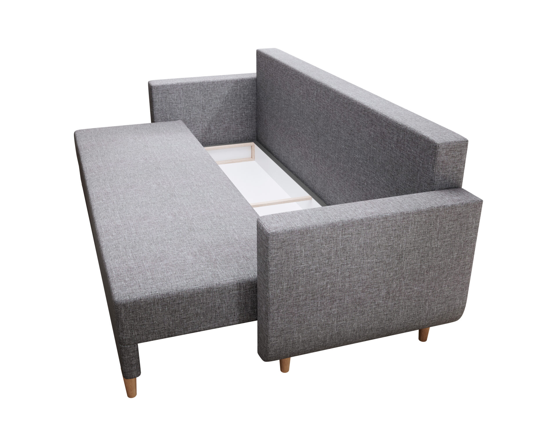 Tkanina obiciowa zachwyca nie tylko aksamitną fakturą. Jest również wyjątkowo praktyczna w codziennym użytkowaniu. Specjalna powłoka utrudnia wchłanianie rozlanych płynów. Dlatego przypadkowa plama z kawy czy soku nie będzie już problemem. Materiał jest także przyjazny zwierzętom. Jego struktura jest odporna na zaciągnięcia pazurkami. Kanapa posiada funkcję spania z prostym mechanizmem rozkładania DL. Wewnątrz ukryto praktyczny pojemnik na pościel. Pomaga on utrzymać porządek w salonie.