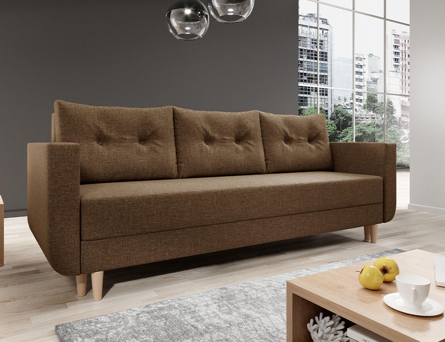 Jej uniwersalny design opiera się na prostych liniach i eleganckim wykończeniu. Dzięki temu z łatwością dopasuje się do wnętrz nowoczesnych oraz klasycznych. Wysokie nóżki z drewna bukowego dodają bryle wizualnej lekkości. Głęboki, brązowy odcień wprowadza do pomieszczenia poczucie bezpieczeństwa i spokoju. W ten sposób salon staje się idealnym miejscem do wyciszenia po długim dniu. Co ważne, tapicerowany tył pozwala ustawić kanapę w dowolnym miejscu, nawet na środku pokoju.