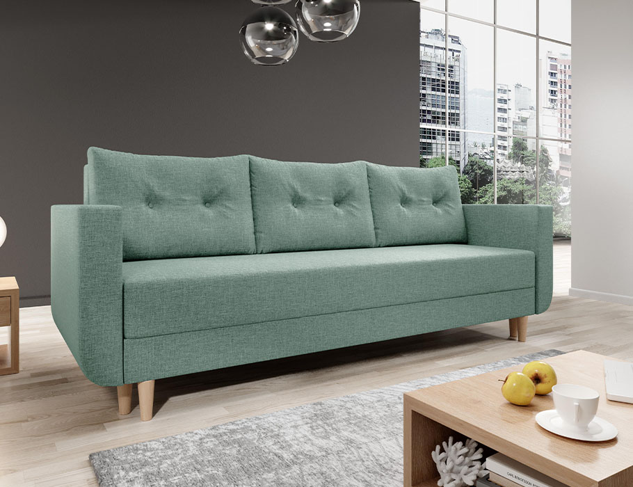 Siedzisko wypełnione sprężynami bonellowymi oraz pianką zapewnia stabilne i komfortowe podparcie. Idealnie sprawdza się podczas wieczornego relaksu z książką. Trzy duże poduszki oparciowe pozwalają wygodnie się oprzeć. Kanapa posiada także praktyczną funkcję spania. Jej proste rozkładanie pozwala szybko przygotować miejsce noclegowe dla gości. Dodatkowy pojemnik dyskretnie mieści pościel lub koce, pomagając w zachowaniu porządku.