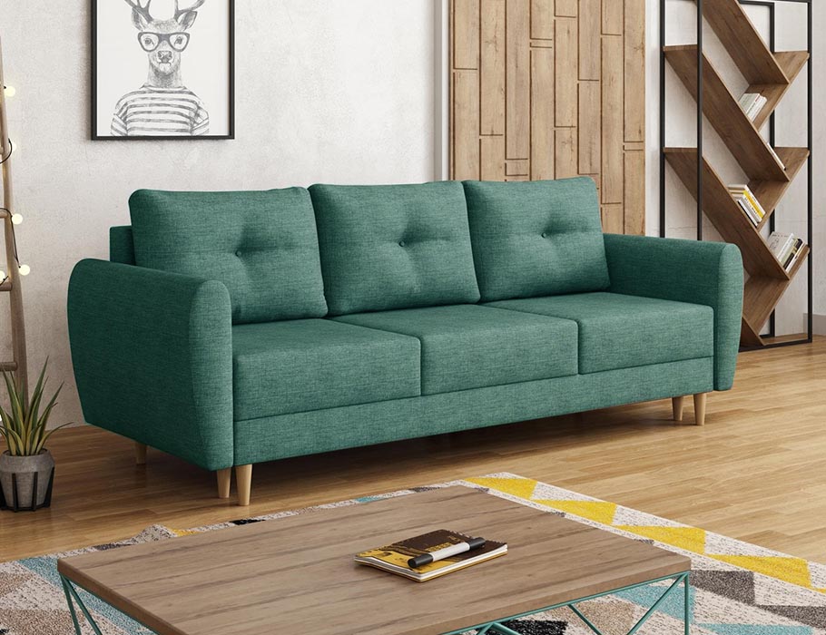 Turkusowa kanapa Manstad wnosi do salonu świeżość i skandynawską prostotę.