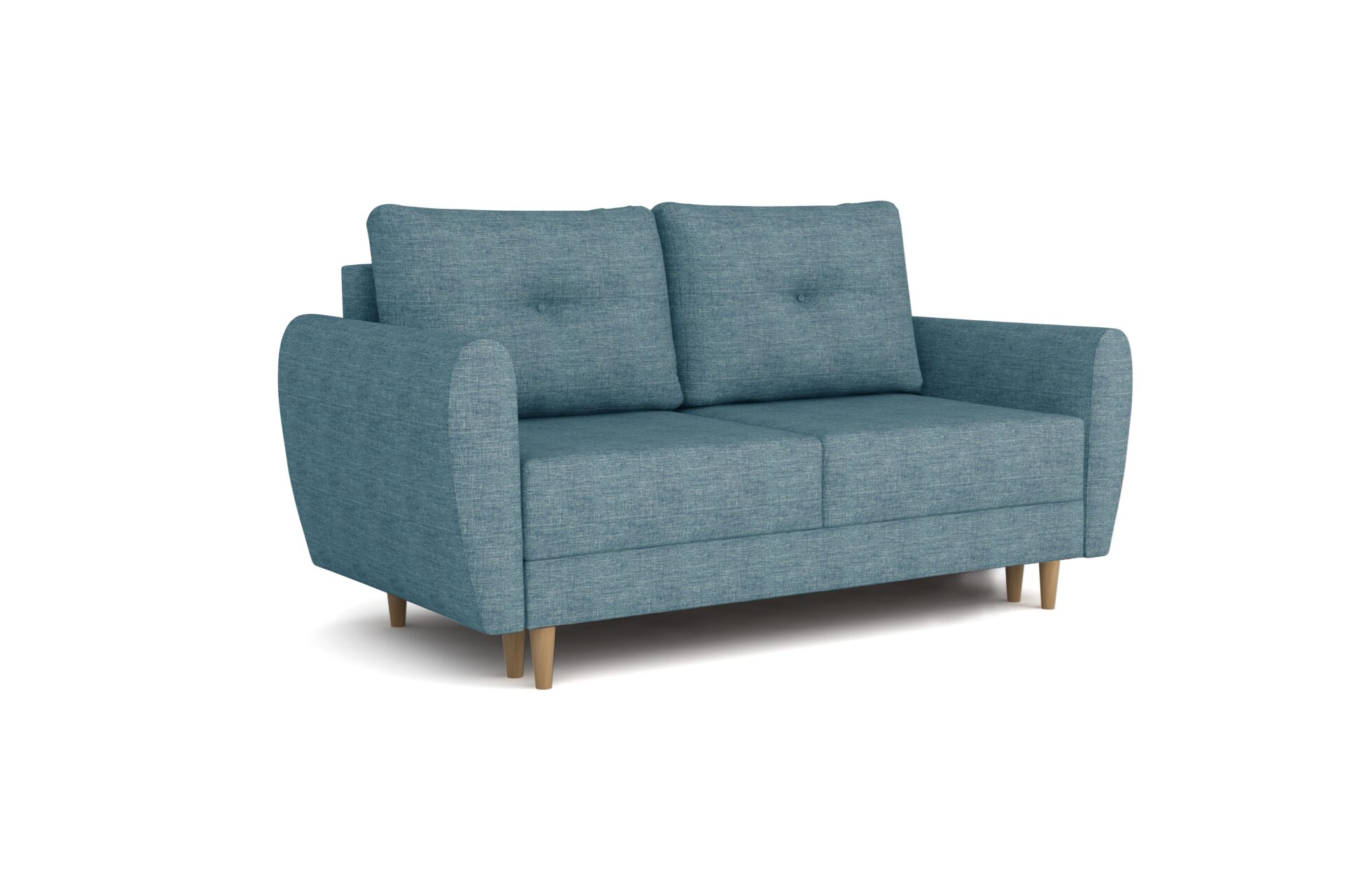 Jej zgrabna bryła opiera się na wysokich, drewnianych nóżkach w naturalnym odcieniu buku. Dzięki temu cała konstrukcja nabiera wizualnej lekkości i subtelności. Głęboki, niebieski kolor tapicerki wnosi do pokoju atmosferę spokoju oraz wyrafinowanej elegancji. Co ważne, tapicerowany tył pozwala ustawić mebel w dowolnym miejscu. W ten sposób kanapa świetnie prezentuje się również na środku salonu.
