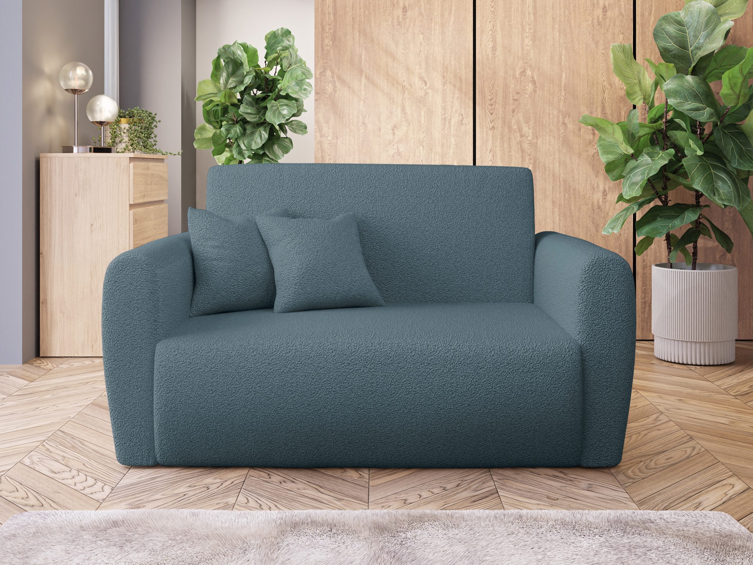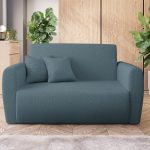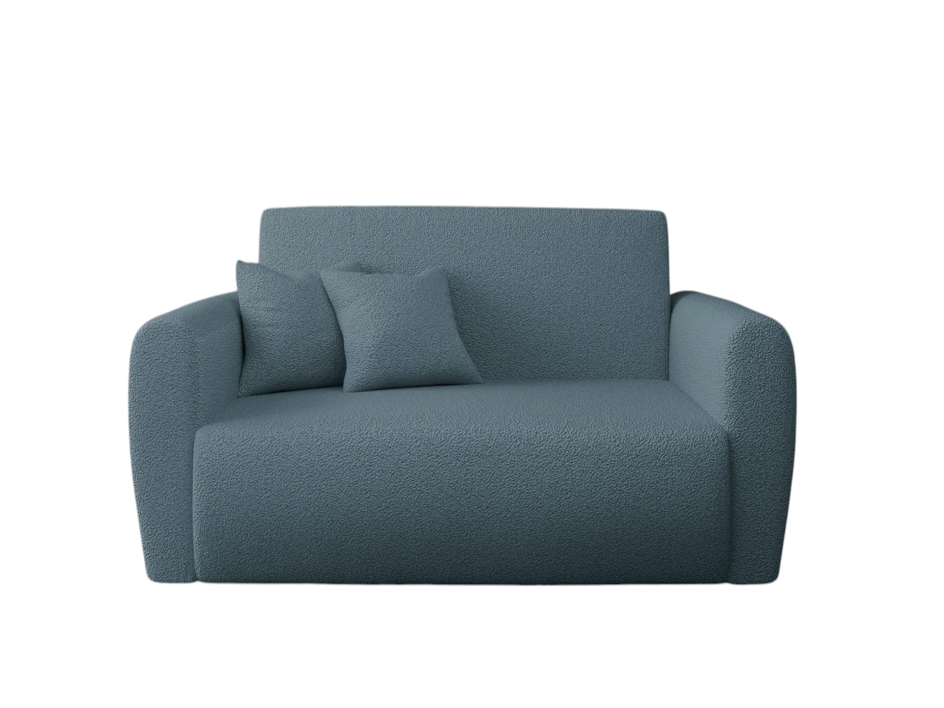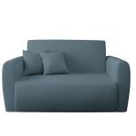 Jej kompaktowy kształt idealnie pasuje do pokoju młodzieżowego lub niewielkiego salonu. Charakterystyczna pętelkowa struktura materiału nadaje meblowi przytulny i ciekawy wygląd. Niebieski odcień tapicerki wprowadza do aranżacji spokój i poczucie swobody. Dzięki temu wnętrze staje się miejscem relaksu i wyciszenia po długim dniu. Co ważne, tapicerowany tył pozwala ustawić amerykankę w dowolnym miejscu, nawet na środku pokoju.