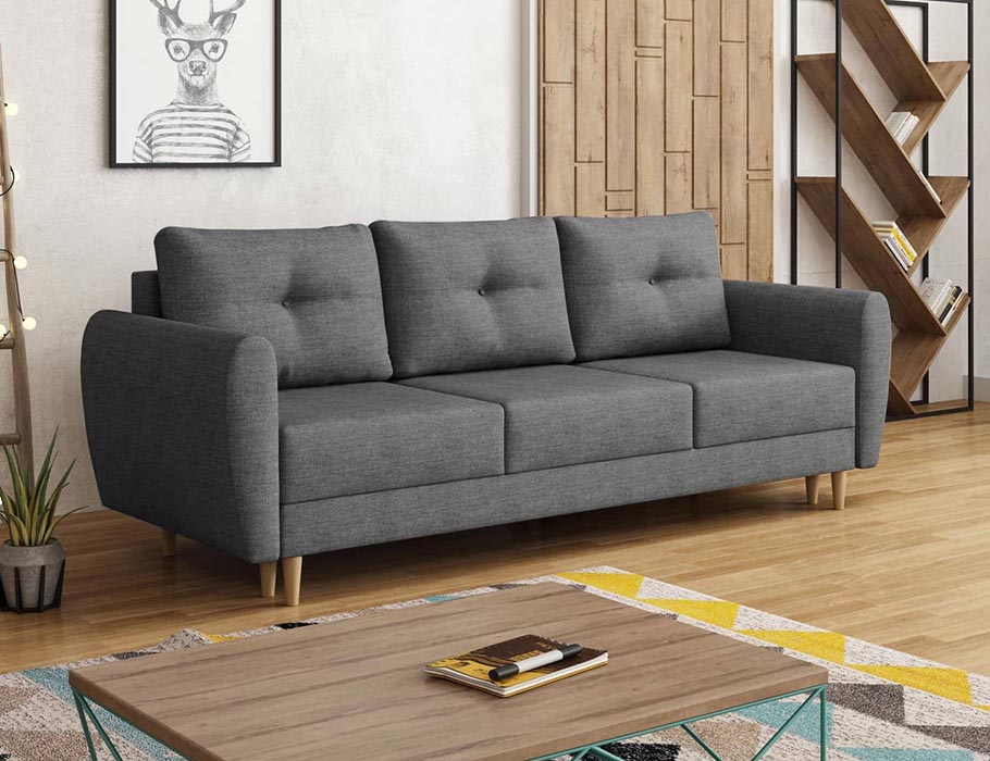 Co ważne, mebel jest doskonale przygotowany na codzienne wyzwania. Posiada prostą w obsłudze funkcję spania typu DL, która w kilka chwil zmienia go w wygodne łóżko dla gości. Pod siedziskiem znajduje się duży pojemnik na pościel. Pozwala on przechować dodatkowe koce i poduszki, pomagając utrzymać porządek w salonie.
