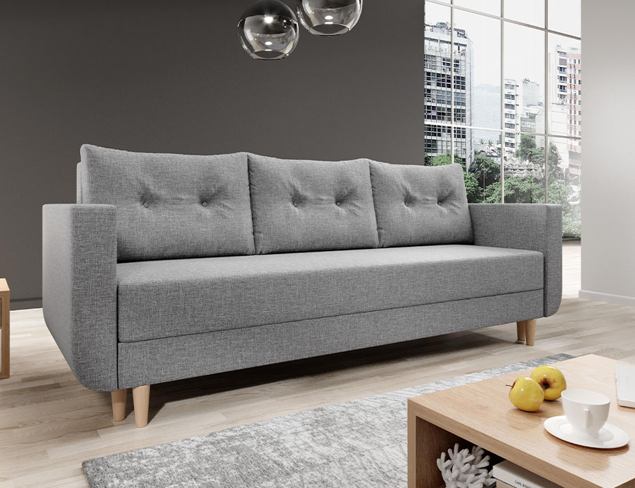 Delikatny, jasnoszary kolor tkaniny subtelnie rozjaśnia pomieszczenie i daje poczucie przestronności. Wysokie nóżki z drewna bukowego dodają konstrukcji wizualnej lekkości. Dzięki temu kanapa prezentuje się elegancko i zgrabnie. Co ważne, jej tył również został obity materiałem. W ten sposób mebel może stanąć w centralnym punkcie pokoju, doskonale organizując jego przestrzeń.