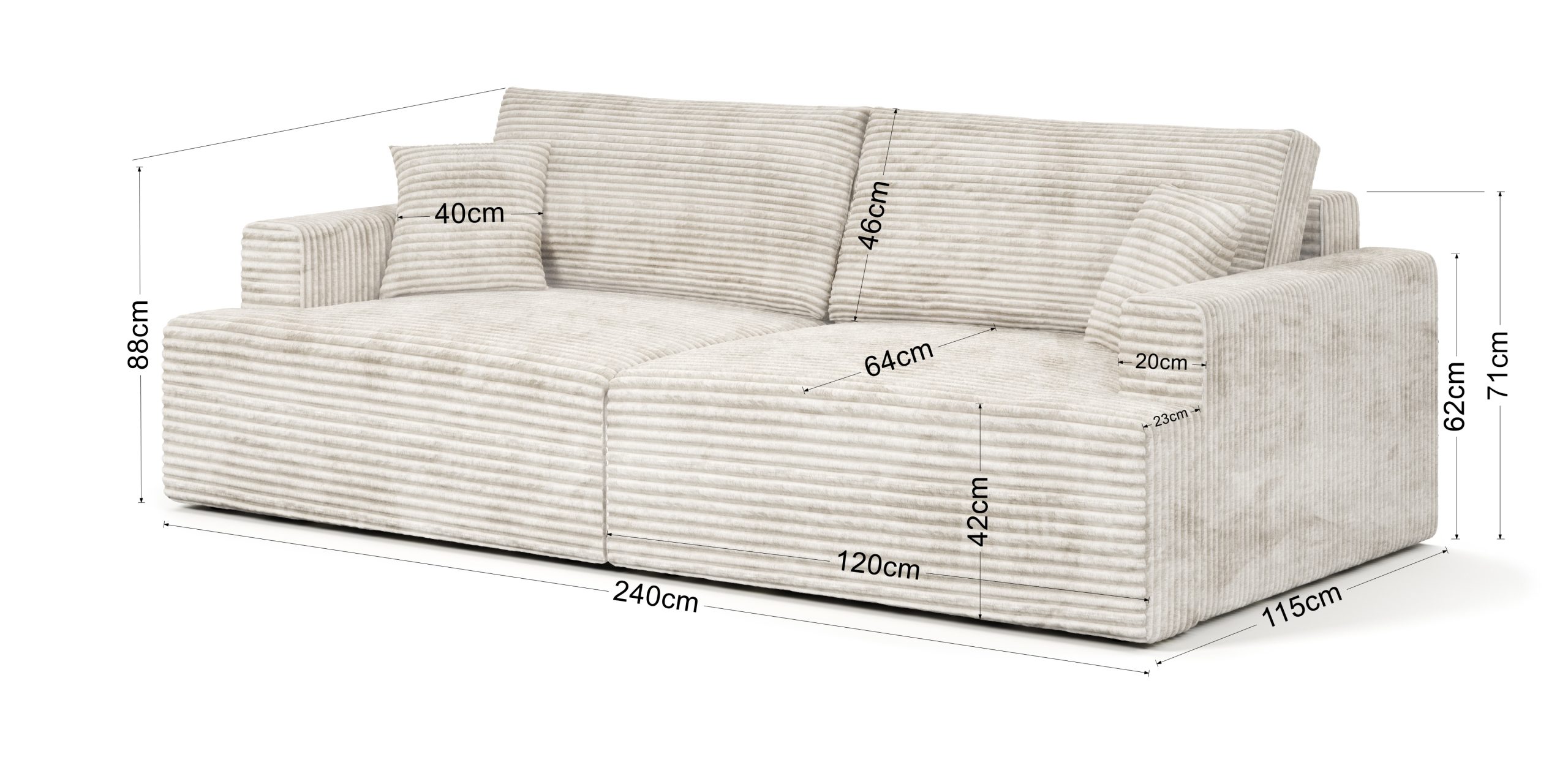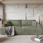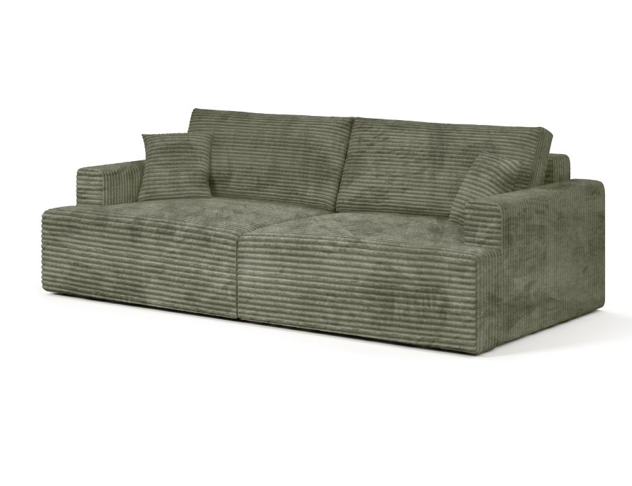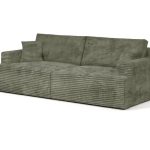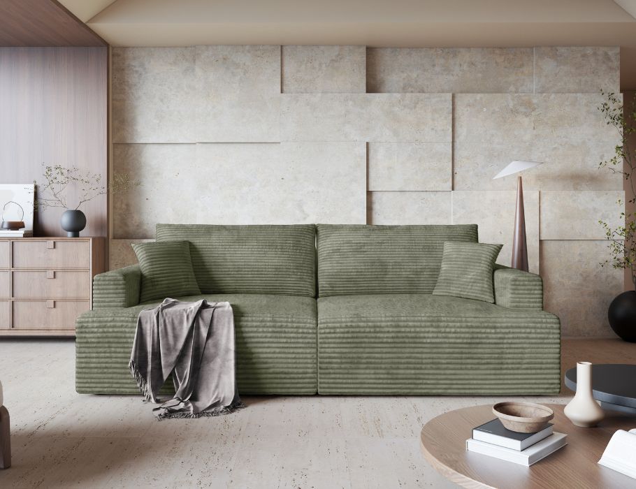 Jej prosty, ponadczasowy design z łatwością dopasuje się do wnętrz klasycznych oraz nowoczesnych. Głęboki, oliwkowy odcień tapicerki wprowadza do salonu atmosferę spokoju i bliskości z naturą. Kolor ten pięknie komponuje się z drewnem, bielą i odcieniami ziemi, tworząc przytulną przestrzeń do odpoczynku. Mięsista faktura sztruksu Poso dodaje całości elegancji i ciepła. Dzięki tapicerowanemu tyłowi kanapa może stanąć w dowolnym miejscu, nawet na środku pokoju.