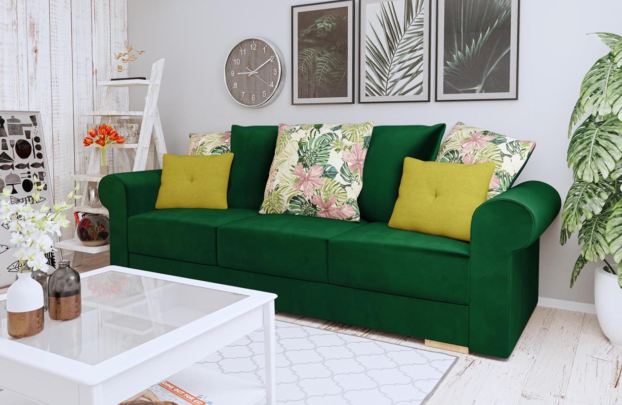 Klasyczna kanapa Sofia w kolorze butelkowej zieleni zachwyca aksamitną tkaniną. Jej ponadczasowa forma opiera się na niskich, drewnianych nóżkach w naturalnym odcieniu buku. Dlatego mebel prezentuje się solidnie i bardzo elegancko. Głęboka, butelkowozielona barwa nadaje wnętrzu szlachetny charakter. Wprowadza do salonu atmosferę spokoju i wyciszenia, idealnie pasując do klasycznych oraz inspirowanych naturą aranżacji.