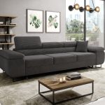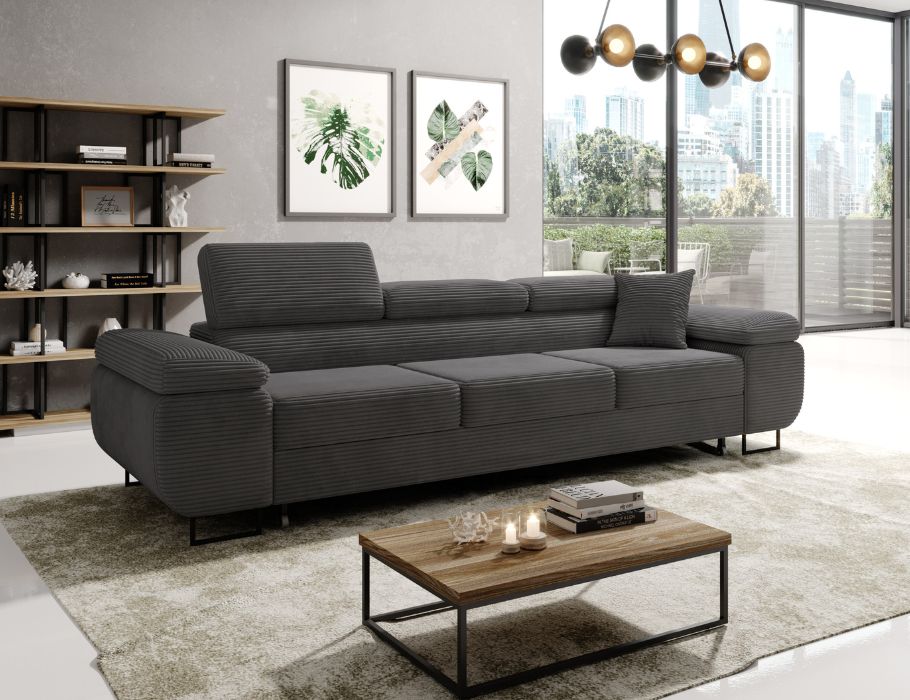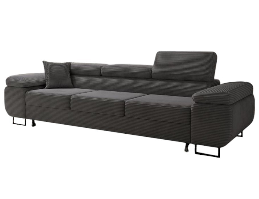 Grafitowy odcień tapicerki wprowadza do wnętrza spokój oraz ponadczasową elegancję. Stanowi on doskonałą bazę dla aranżacji w stylu nowoczesnym lub loftowym. Można go łatwo ożywić kolorowymi dodatkami. Co ważne, tapicerowany tył pozwala ustawić kanapę w dowolnym miejscu salonu, także na środku pomieszczenia. W ten sposób zyskuje się pełną swobodę w projektowaniu strefy wypoczynku.