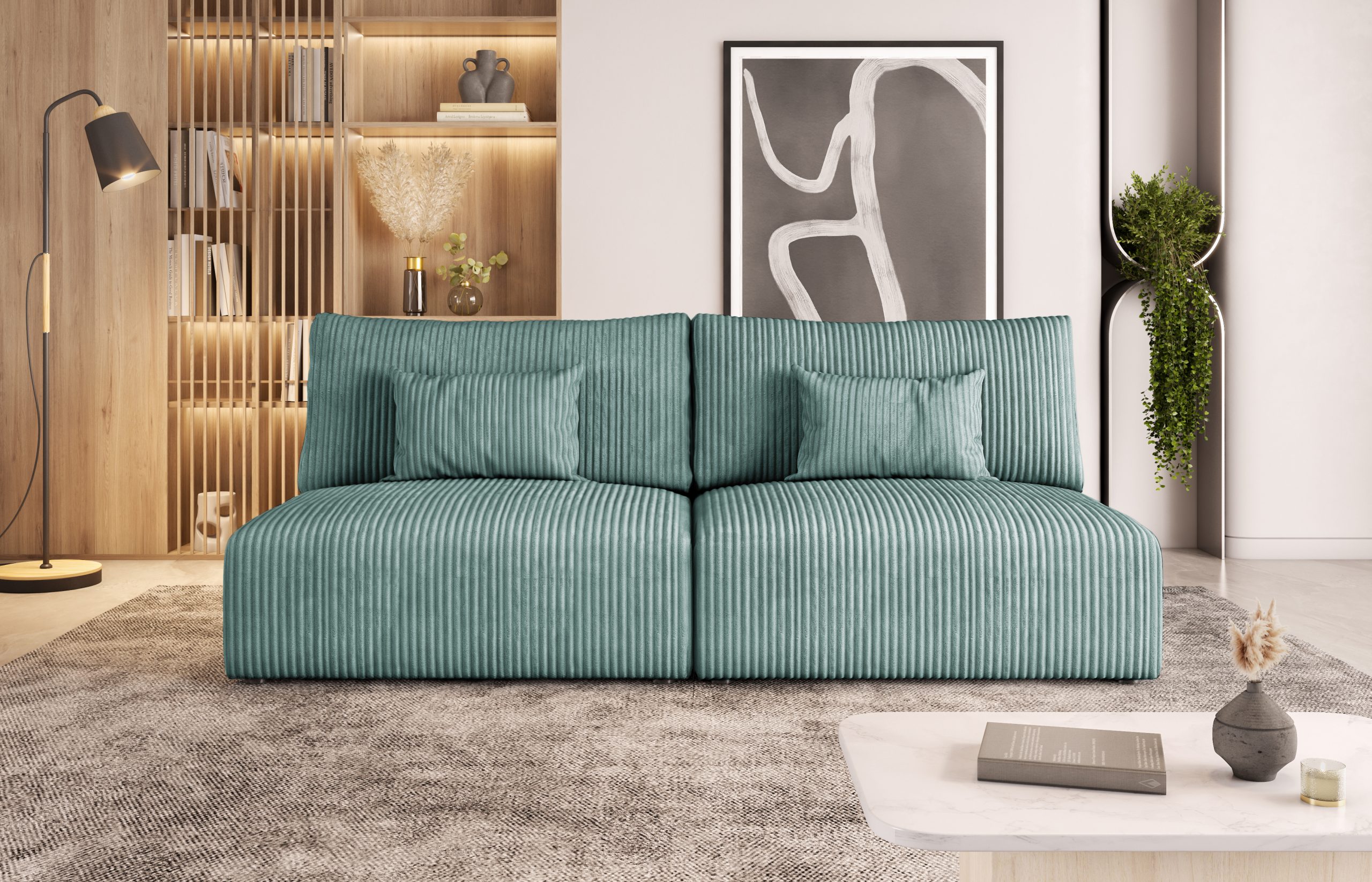 Kanapa Modulo jest także niezwykle praktyczna w codziennym użytkowaniu. Posiada intuicyjną funkcję spania rozkładaną za pomocą automatu DL. Dzięki temu przygotowanie miejsca dla gości zajmuje tylko chwilę. Duży pojemnik pod siedziskiem ułatwia przechowywanie pościeli lub koców. W ten sposób salon pozostaje zawsze uporządkowany. Co ważne, tkanina Poso utrudnia wchłanianie płynów i jest przyjazna zwierzętom. Dlatego turkusowa kanapa Modulo to świetny wybór dla właścicieli psów oraz kotów.