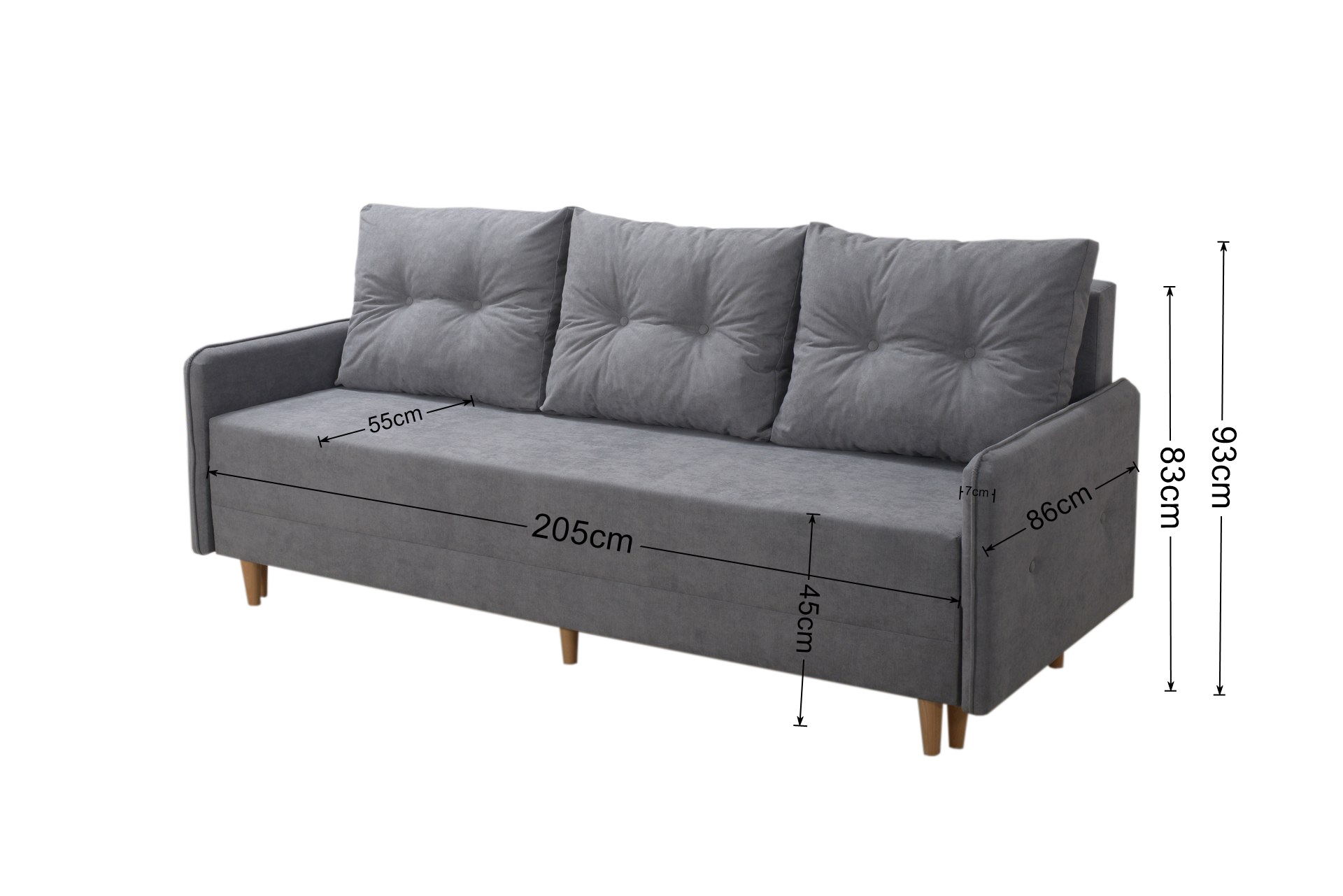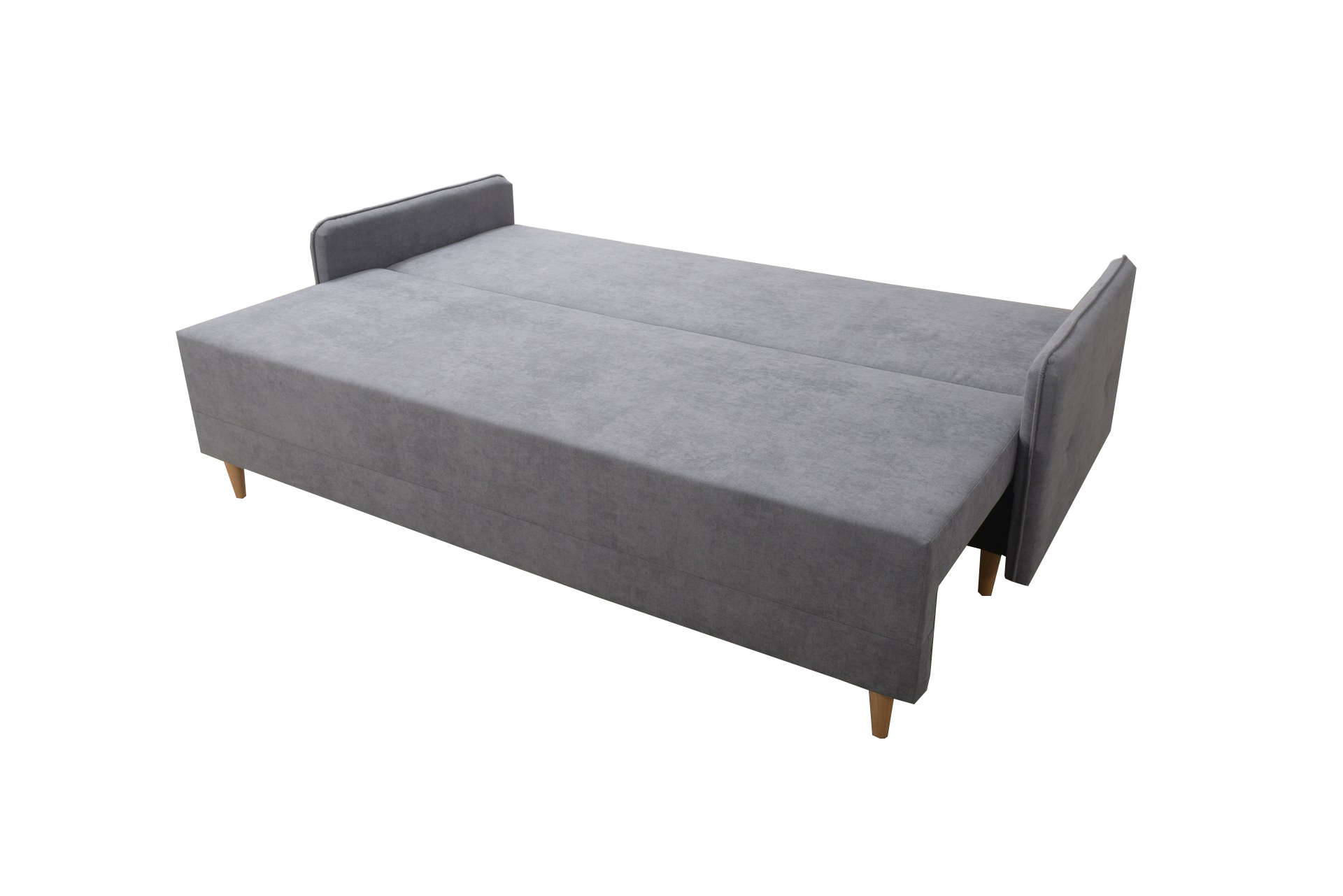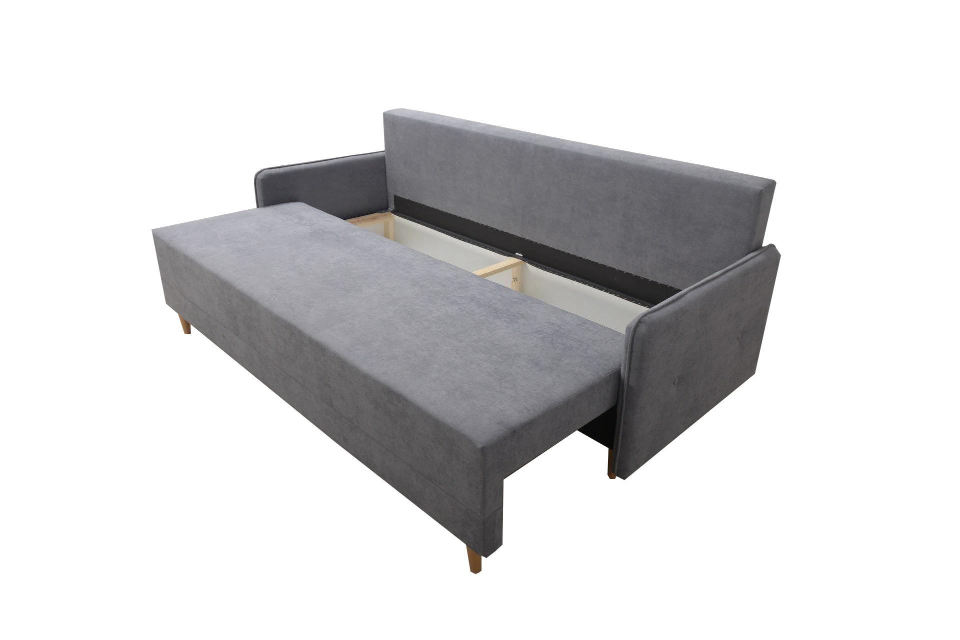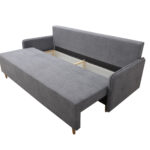 Wygodne siedzisko wypełnione sprężynami bonellowymi i pianką zaprasza do odpoczynku po długim dniu. Miękkie oparcie oraz trzy duże poduszki pozwalają znaleźć idealną pozycję do czytania książki lub oglądania filmu. W razie potrzeby kanapę można łatwo zmienić w komfortowe miejsce do spania. Rozkładanie za pomocą systemu DL jest proste i nie wymaga wysiłku. Dzięki temu dom zyskuje dodatkowe posłanie dla gości. Wbudowany pojemnik na pościel pomaga z kolei utrzymać porządek w salonie.