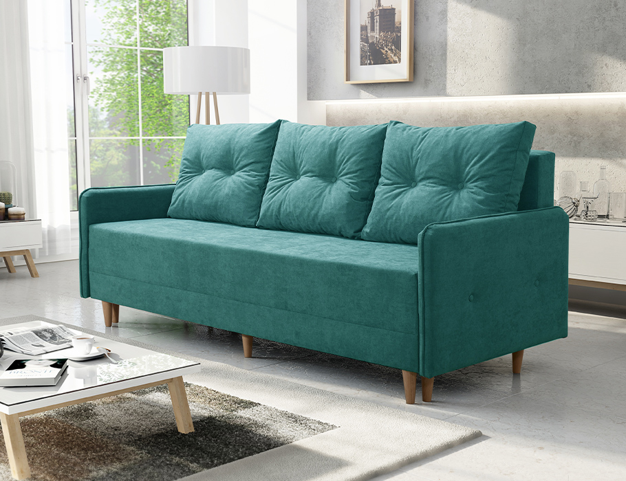 Prosta, geometryczna bryła zyskuje lekkość dzięki wysokim nóżkom. Wykonano je z naturalnego drewna bukowego, które wprowadza do wnętrza ciepły akcent. Głęboki turkusowy kolor tapicerki staje się wyrazistym elementem wystroju salonu. Wprowadza do aranżacji ożywczą atmosferę i świetnie komponuje się zarówno z nowoczesnym, jak i klasycznym stylem. Co ważne, tapicerowany tył mebla pozwala ustawić go w dowolnym miejscu pokoju, nie tylko przy ścianie.