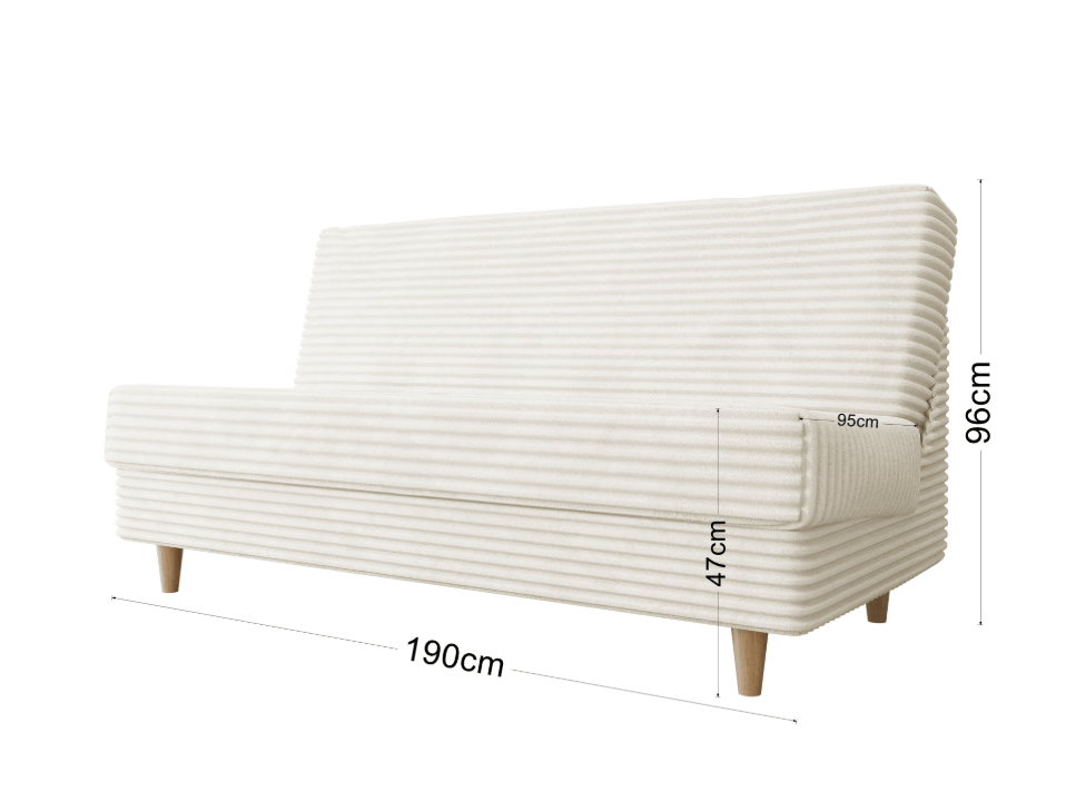 Brak podłokietników sprawia, że wersalka Luna prezentuje się lekko i nowocześnie, a jednocześnie doskonale wpisuje się w wystrój małych wnętrz. Jej minimalistyczny wygląd podkreśla elegancję i funkcjonalność, co czyni ją doskonałym wyborem do mieszkań, gdzie liczy się każdy centymetr przestrzeni.