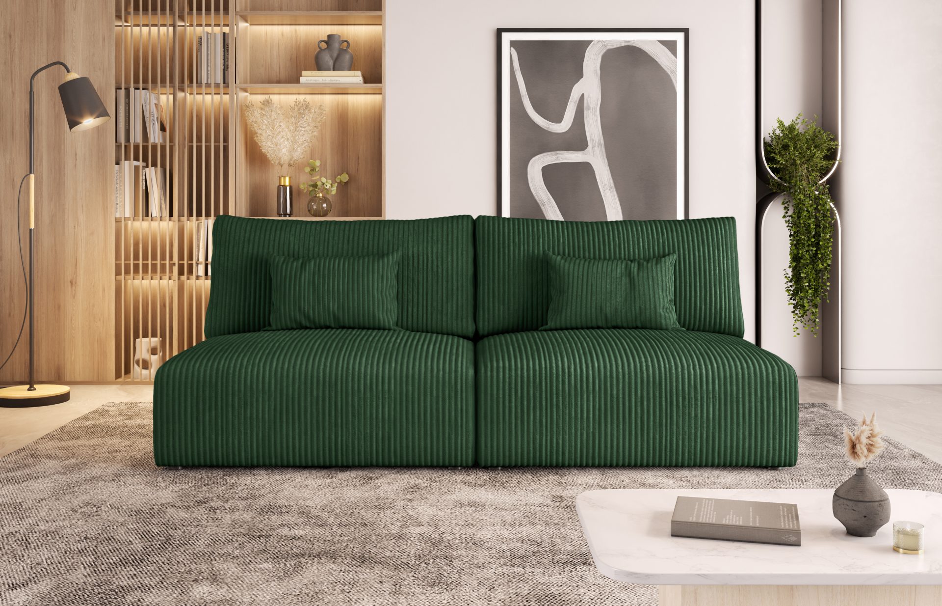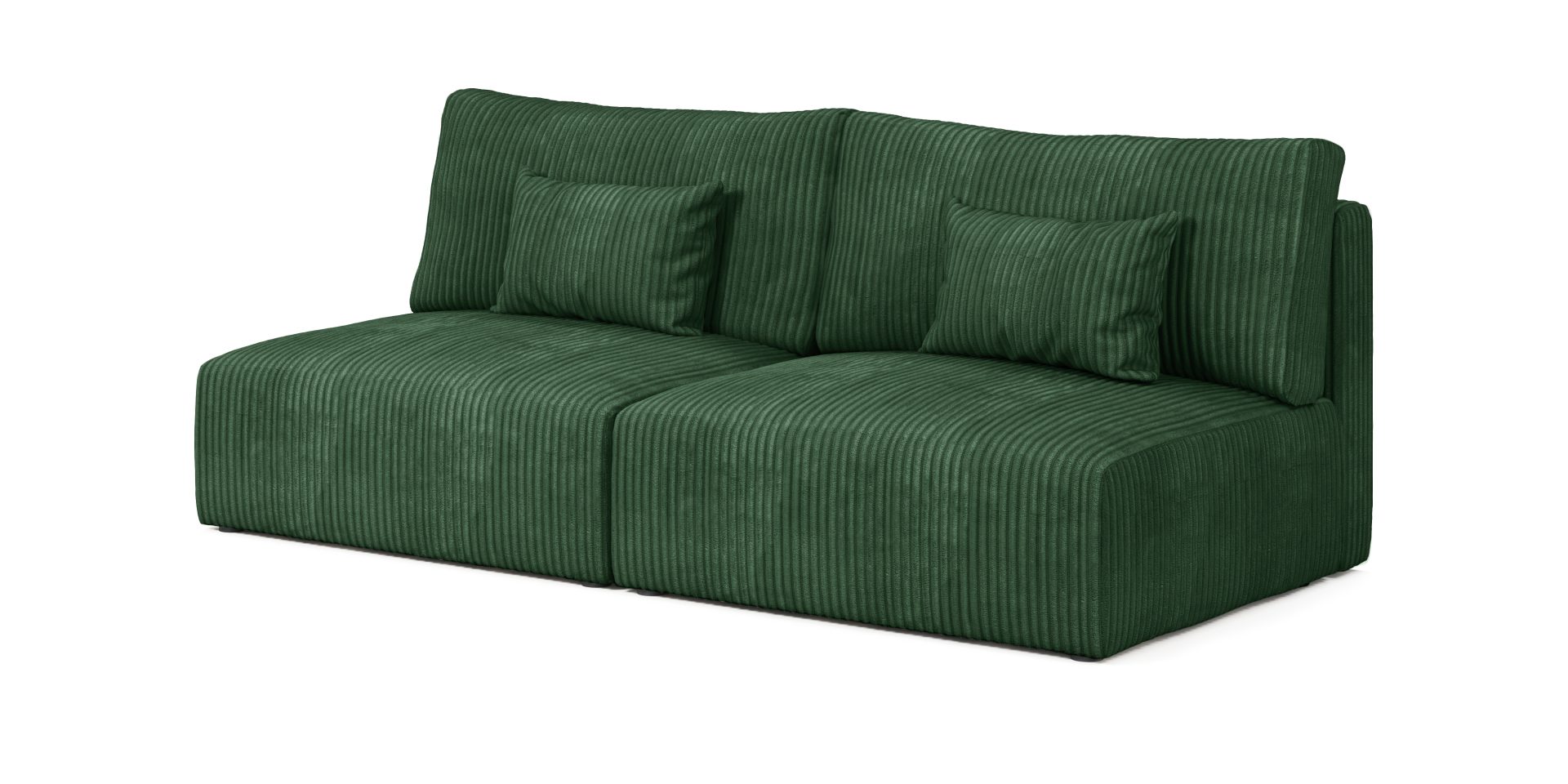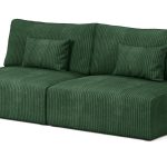 Jej prosta, geometryczna bryła doskonale wpisuje się w nowoczesne aranżacje. Głęboki odcień butelkowej zieleni nadaje salonowi elegancji oraz przytulności. Kolor ten pięknie komponuje się z drewnem lub metalowymi dodatkami w złotym kolorze. Charakterystyczna faktura sztruksu sprawia, że mebel jest niezwykle przyjemny w dotyku. Dzięki tapicerowanemu tyłowi kanapę można ustawić w dowolnym miejscu, czyniąc z niej centralny punkt każdego spotkania.