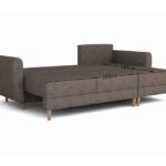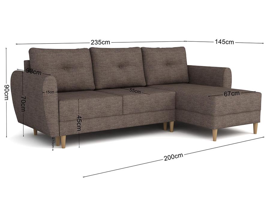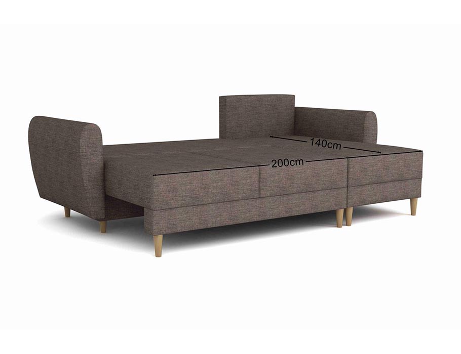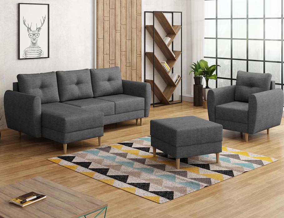 Jego klasyczna forma o prostych liniach tworzy w salonie atmosferę porządku i elegancji. Ciemnoszary odcień tapicerki jest niezwykle uniwersalny. Stanowi idealne tło dla kolorowych dodatków lub stonowaną bazę dla minimalistycznych aranżacji. Wysokie nóżki z naturalnego drewna dodają meblom wizualnej lekkości. W ten sposób podkreślają inspirację stylem skandynawskim, ułatwiając jednocześnie utrzymanie czystości pod meblami. Co ważne, tapicerowany tył pozwala na umieszczenie narożnika w dowolnym miejscu, nawet na środku pokoju.