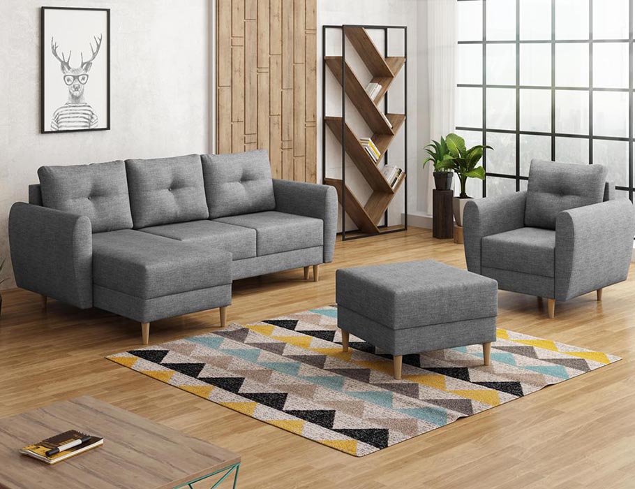 W skład zestawu wchodzi także komfortowy fotel oraz praktyczna pufa. Tworzą one spójną strefę relaksu dla całej rodziny. Fotel doskonale sprawdzi się jako miejsce do czytania. Pufa z kolei może służyć jako podnóżek lub dodatkowe siedzisko. Dużą zaletą jest praktyczny pojemnik na pościel ukryty w konstrukcji narożnika. Ułatwia on utrzymanie porządku w salonie i przechowywanie tekstyliów.