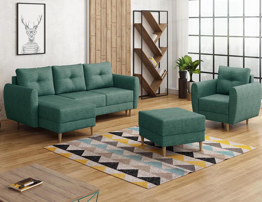 Siedziska narożnika i fotela wypełniono sprężynami falistymi oraz elastyczną pianką. Gwarantuje to stabilne podparcie i komfort podczas codziennego odpoczynku. Duże poduszki oparciowe pozwalają wygodnie ułożyć się w trakcie wieczornego seansu filmowego. Z kolei fotel tworzy osobistą strefę relaksu z książką. Wielofunkcyjna pufa może służyć za komfortowy podnóżek lub dodatkowe siedzisko dla gości.
