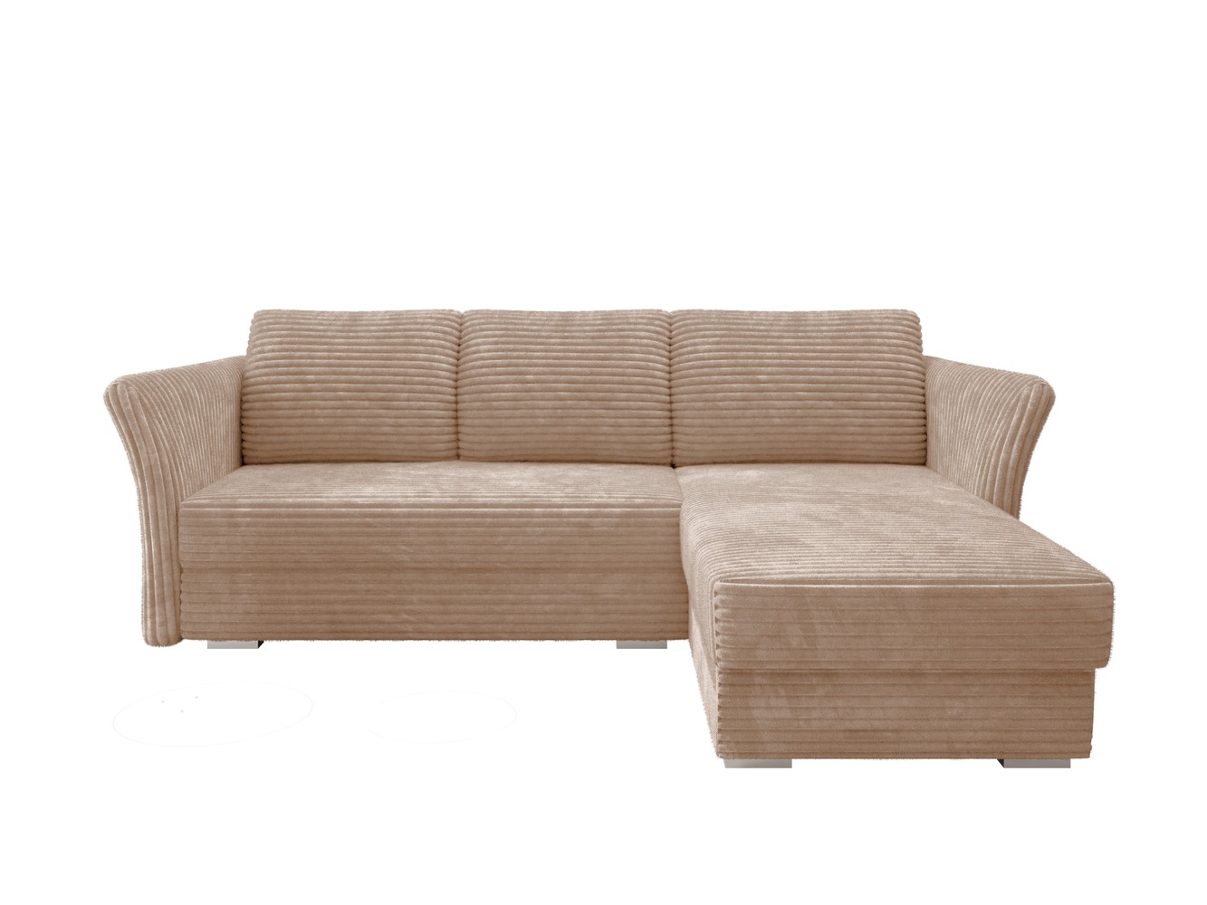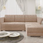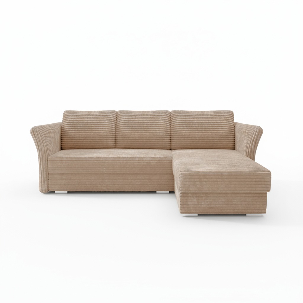 Narożnik wyposażono w praktyczną funkcję spania. Rozkładanie za pomocą automatu DL jest szybkie i nie wymaga wysiłku. W ten sposób w kilka chwil można przygotować komfortowe miejsce do spania dla gości. Duży pojemnik na pościel pomaga utrzymać porządek w salonie. Przechowasz w nim kołdrę, poduszki lub dodatkowe koce. Beżowy narożnik Merino obito tkaniną sztruksową przyjazną zwierzętom oraz środowisku. Materiał utrudnia wchłanianie cieczy, a ewentualne zabrudzenia można łatwo usunąć samą wodą.