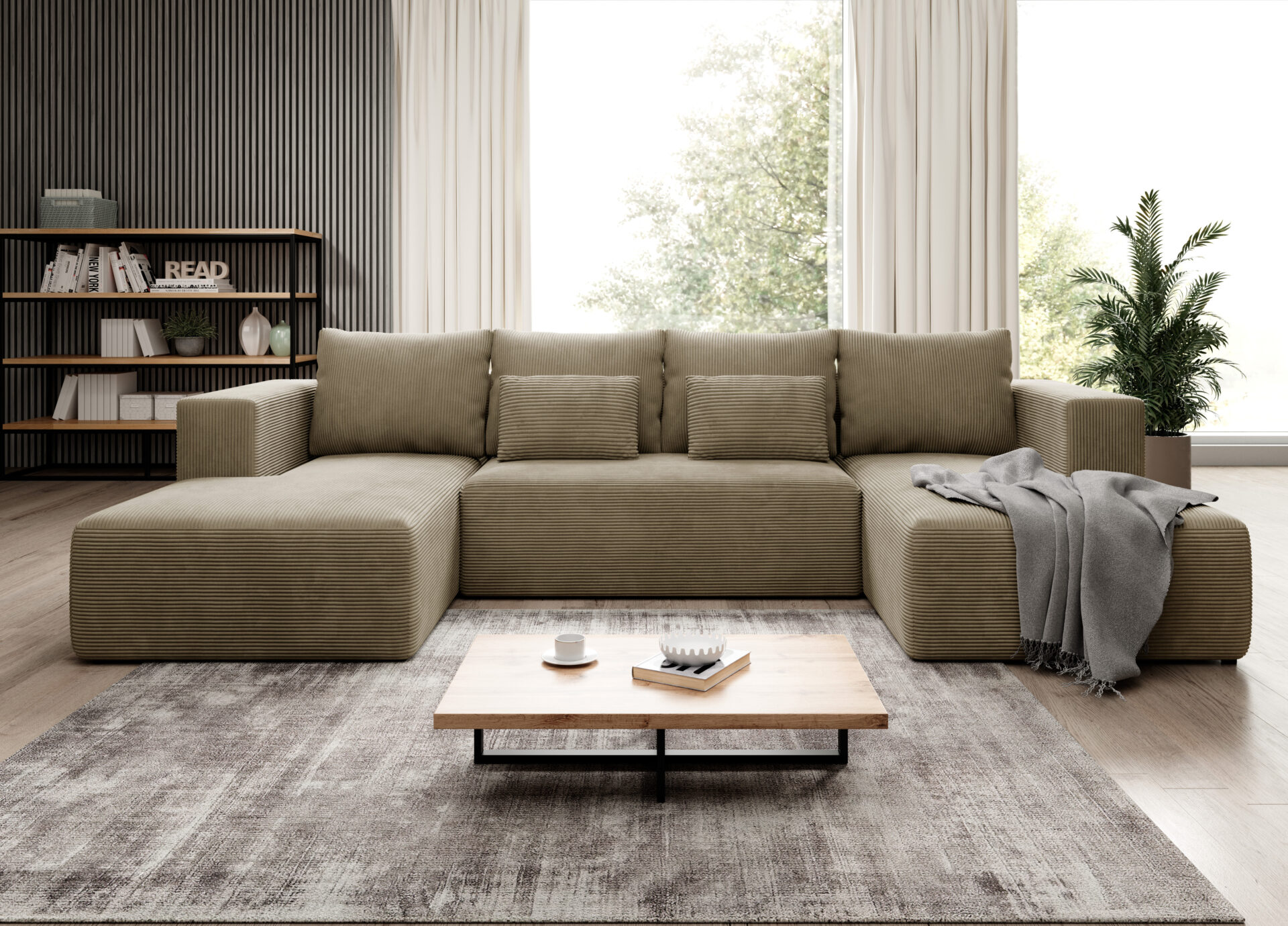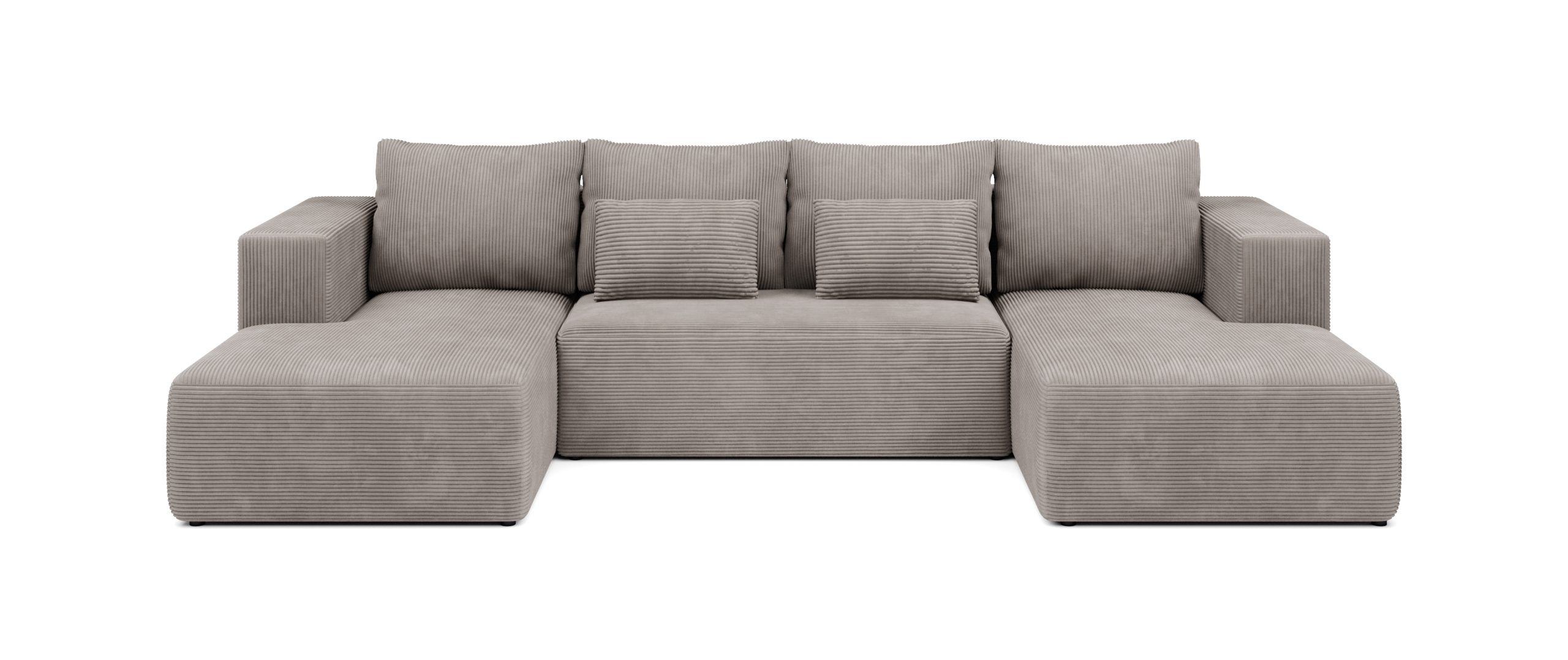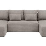 Jego obszerny kształt w formie litery U tworzy przytulną przestrzeń idealną do spotkań z bliskimi. W ten sposób salon staje się centralnym punktem domu, zapraszającym do wspólnego odpoczynku. Ciepły, beżowy odcień tkaniny Poso rozjaśnia wnętrze. Nadaje mu lekkości i spokoju. Dlatego narożnik doskonale wpisuje się w aranżacje w stylu nowoczesnym oraz boho, tworząc subtelną bazę dla dalszych dekoracji. Wyjątkowa faktura sztruksu dodaje całości głębi, a niskie, czarne nóżki podkreślają jego elegancką linię.