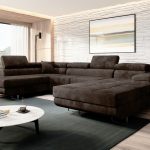 Jego imponujący kształt w formie litery U tworzy w salonie centralną strefę komfortu. Zaprasza do wspólnego spędzania czasu z rodziną i przyjaciółmi. Głęboki brązowy kolor obicia wnosi do wnętrza elegancję oraz ciepło. Dzięki temu salon staje się przytulną oazą spokoju, idealną do odpoczynku. Narożnik doskonale komponuje się z naturalnym drewnem lub nowoczesnymi, metalowymi dodatkami. Wysokie, chromowane nóżki dodają całej bryle wizualnej lekkości. Co ważne, tapicerowany tył pozwala na ustawienie mebla w dowolnym miejscu, nawet na środku pokoju.