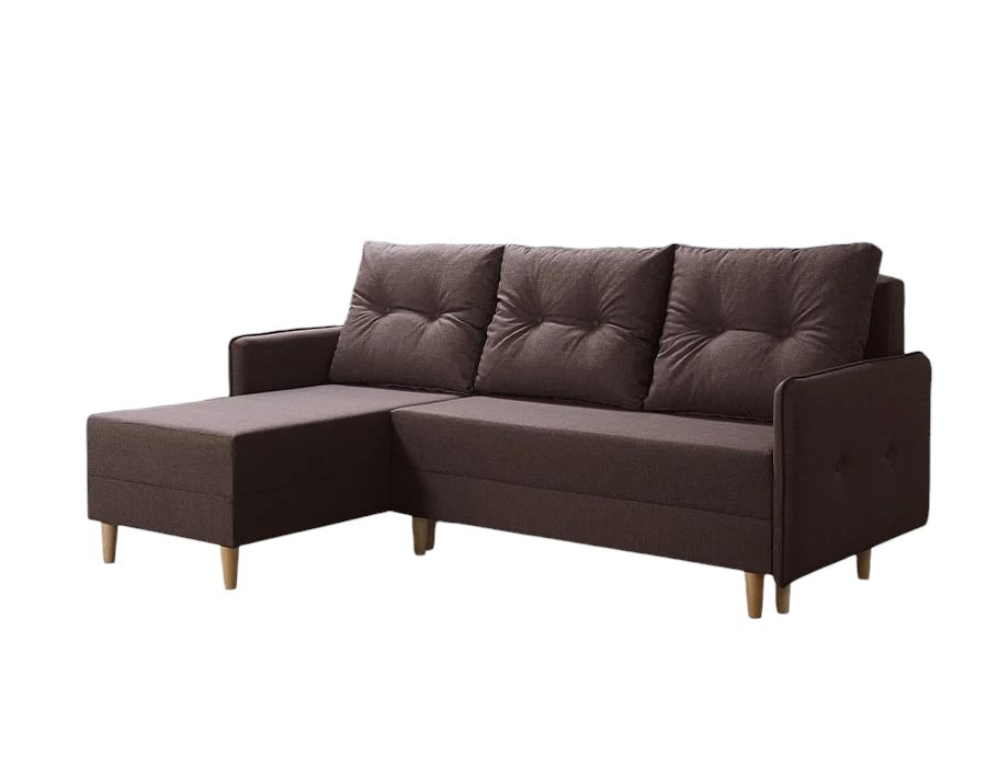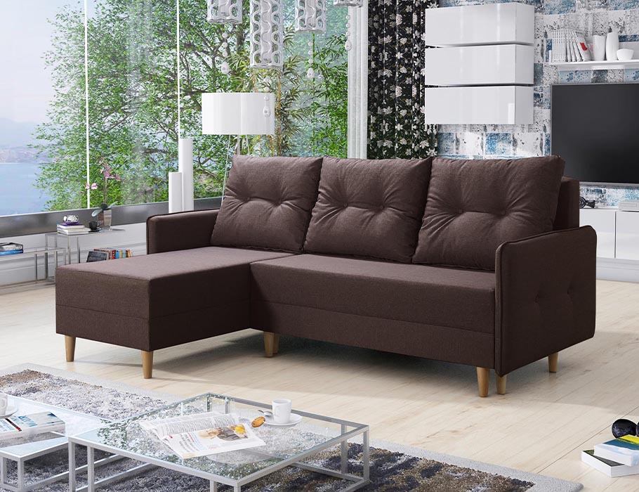 Ciepły, brązowy narożnik FERN wprowadza do wnętrza atmosferę spokoju i domowego komfortu. Jego klasyczna bryła w kształcie litery L została osadzona na wysokich, drewnianych nóżkach w odcieniu naturalnego buku. Dzięki temu mebel zyskuje wizualną lekkość i ponadczasowy charakter, który pasuje zarówno do nowoczesnych, jak i klasycznych aranżacji. Tapicerowany tył pozwala na swobodne ustawienie narożnika w dowolnym miejscu salonu, czyniąc go centralnym punktem domowego życia.