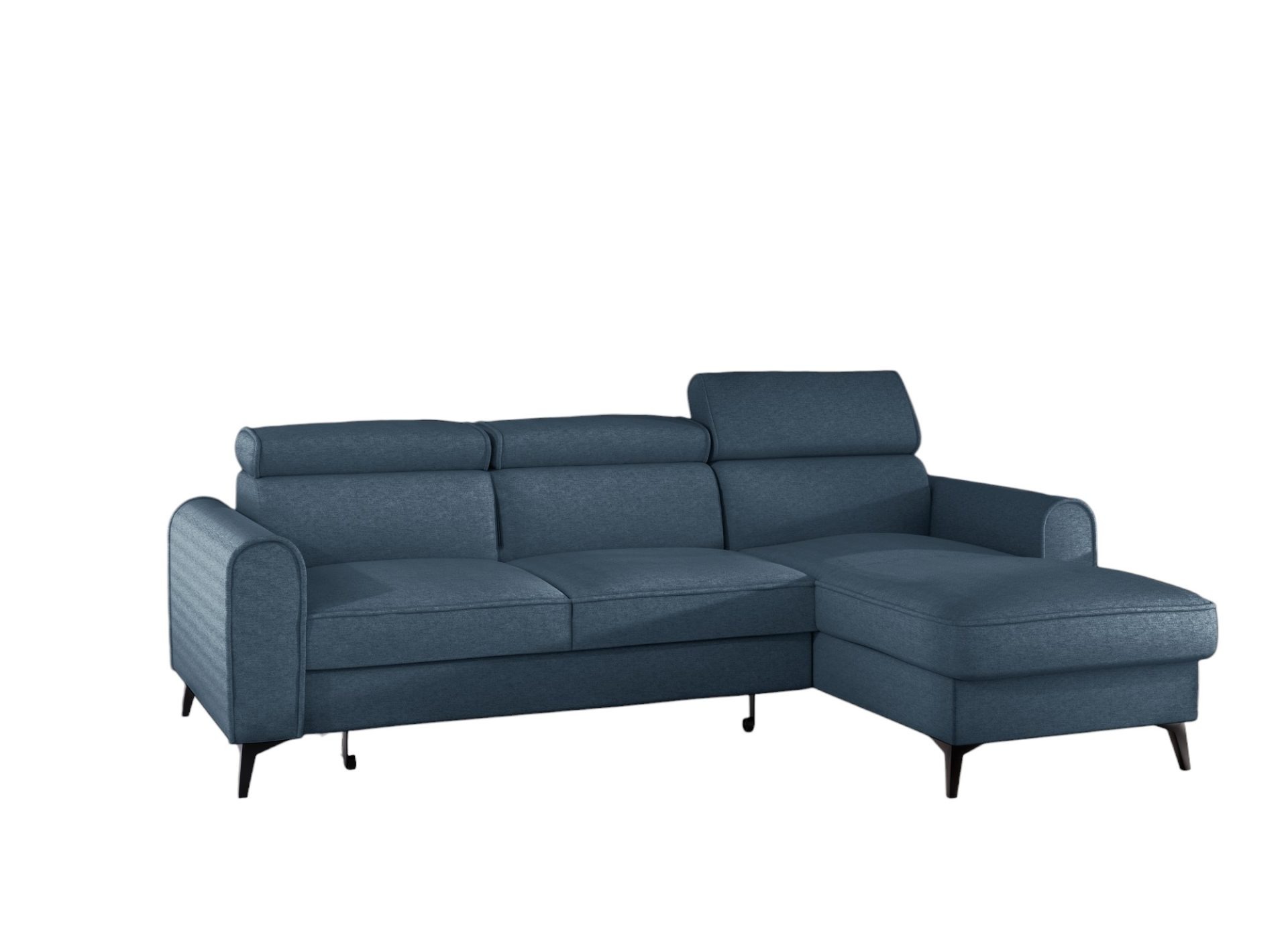 Ciemnoniebieski narożnik Bello to nowoczesny mebel w kształcie litery L, ubrany w przyjemną w dotyku tkaninę szenilową. Jego głęboki odcień wprowadza do wnętrza atmosferę spokoju oraz elegancji. Dlatego model ten świetnie odnajdzie się zarówno w aranżacjach minimalistycznych, jak i tych inspirowanych stylem boho. Smukłe, wysokie nóżki z czarnego metalu dodają konstrukcji lekkości. Co ważne, tapicerowany tył pozwala na ustawienie narożnika w dowolnym miejscu salonu, nie tylko przy ścianie.