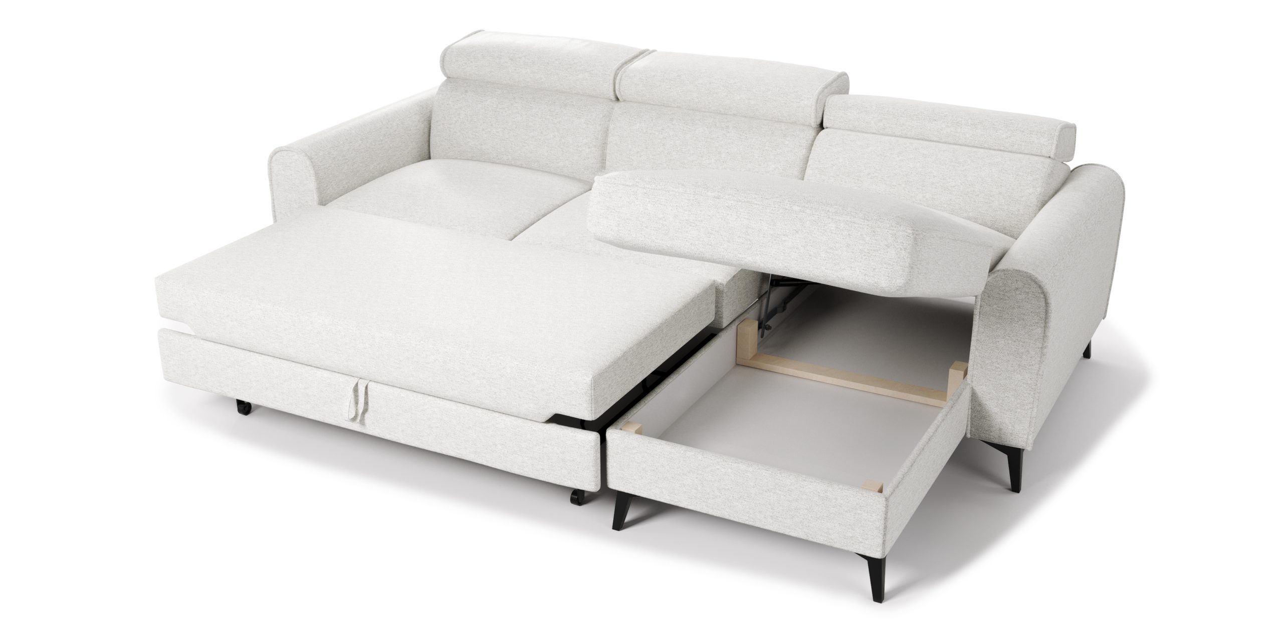 Narożnik Bello z łatwością dostosowuje się do rytmu życia domowników. Gdy odwiedzą nas goście, mebel szybko zamieni się w wygodne miejsce do spania. Funkcja spania z rozkładaniem za pomocą automatu Delfin jest intuicyjna i nie wymaga wysiłku. Dzięki temu przygotowanie dodatkowego posłania zajmuje tylko chwilę. Duży pojemnik na pościel pozwala z kolei utrzymać porządek w salonie. Koce i poduszki są schowane, ale zawsze pod ręką.