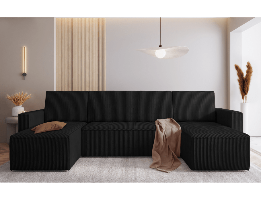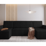 Jego obszerny kształt w formie litery U tworzy idealną przestrzeń do wspólnego wypoczynku. Staje się naturalnym centrum salonu, zapraszając domowników do spędzania czasu razem. Wyrazista, czarna barwa nadaje mu ponadczasowej elegancji. Dlatego mebel świetnie odnajduje się zarówno w aranżacjach nowoczesnych, jak i klasycznych. Stanowi mocny akcent dekoracyjny lub stonowane tło dla innych dodatków.
