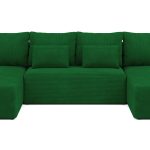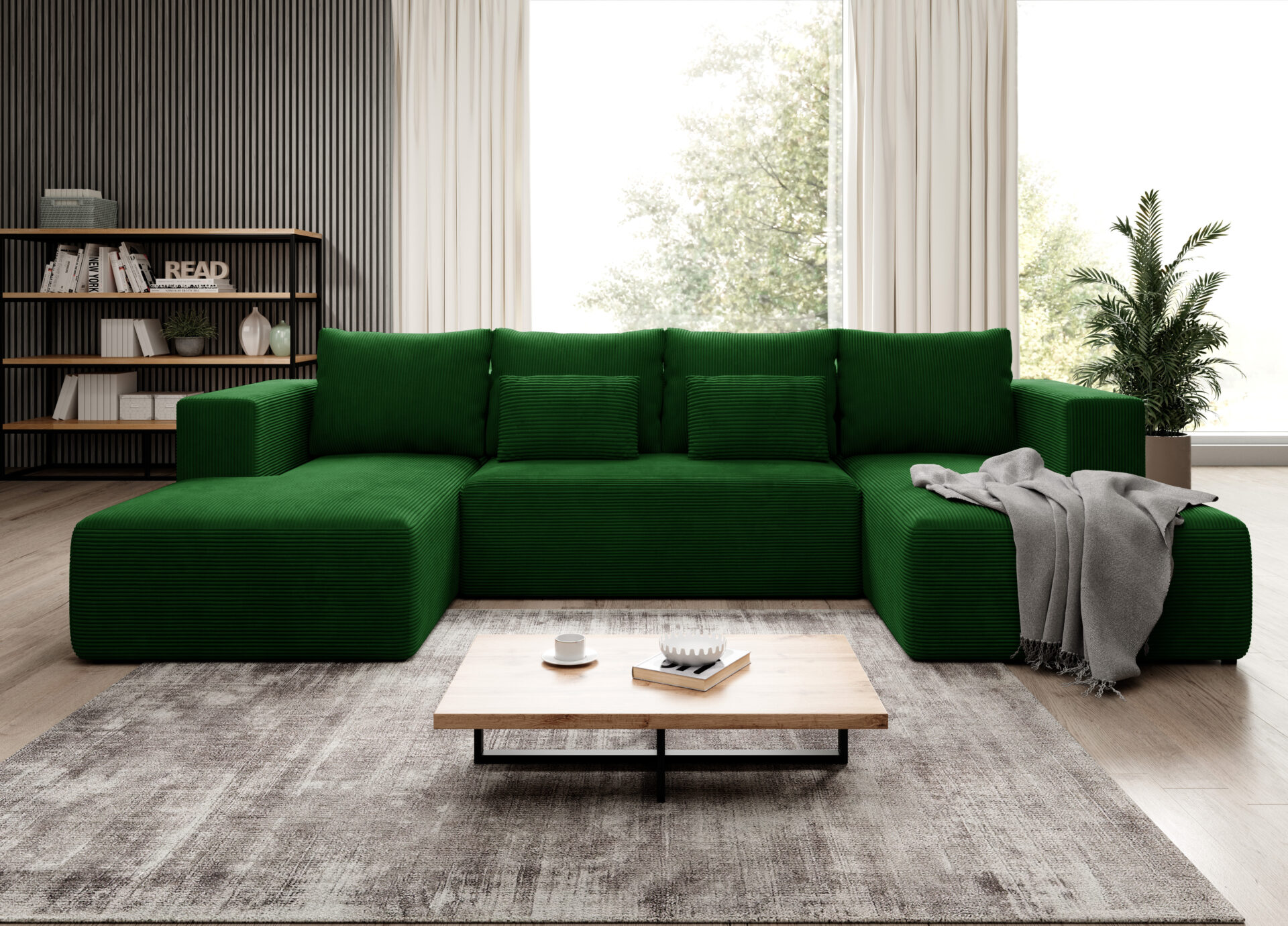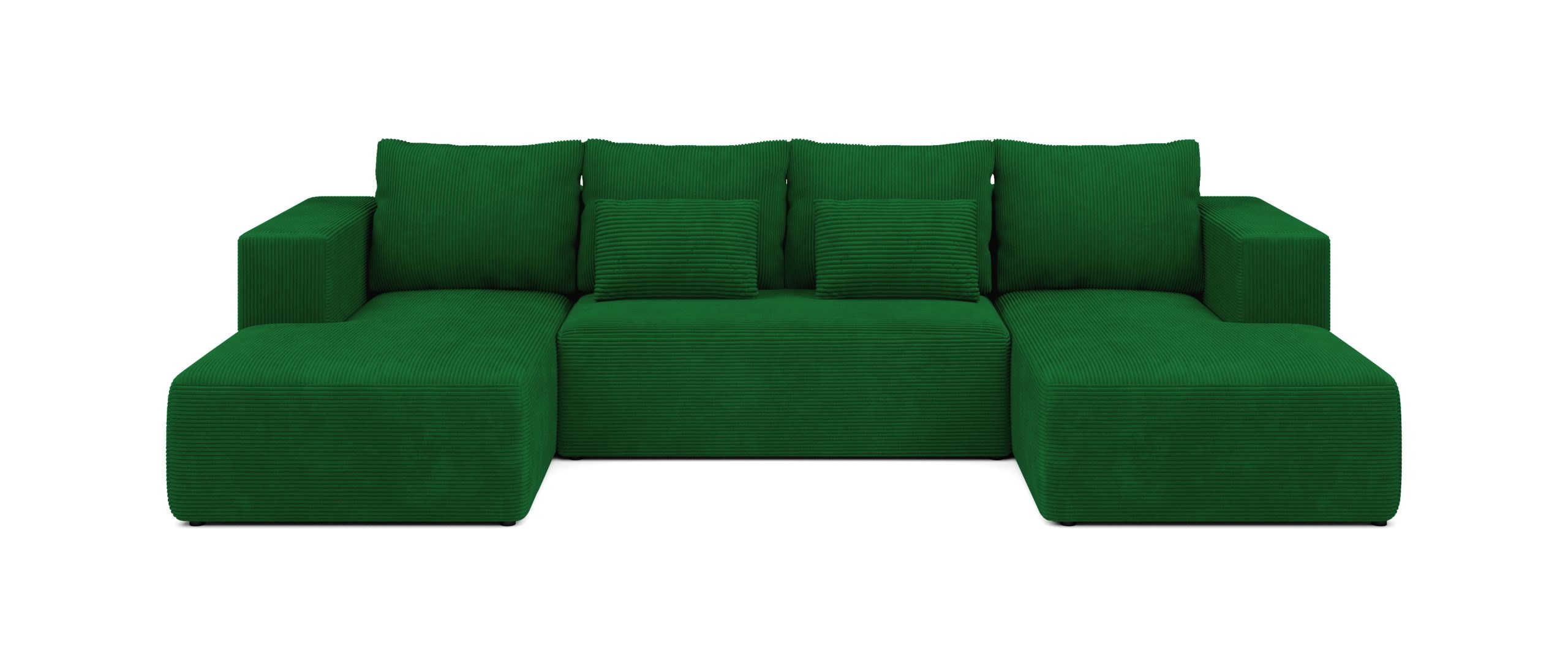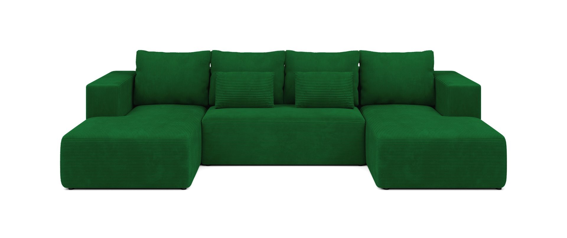 Jego obszerny kształt w formie litery U naturalnie tworzy centrum spotkań w salonie. Głęboki odcień butelkowej zieleni nadaje aranżacji szlachetności. Wprowadza do wnętrza spokój i poczucie bliskości z naturą. Dlatego doskonale pasuje do estetyki nowoczesnej oraz boho. Miękka, prążkowana tkanina sztruksowa dodaje całości przytulnego charakteru. Co ważne, mebel posiada tapicerowany tył. Pozwala to na ustawienie go w dowolnym miejscu, nawet na środku pokoju.