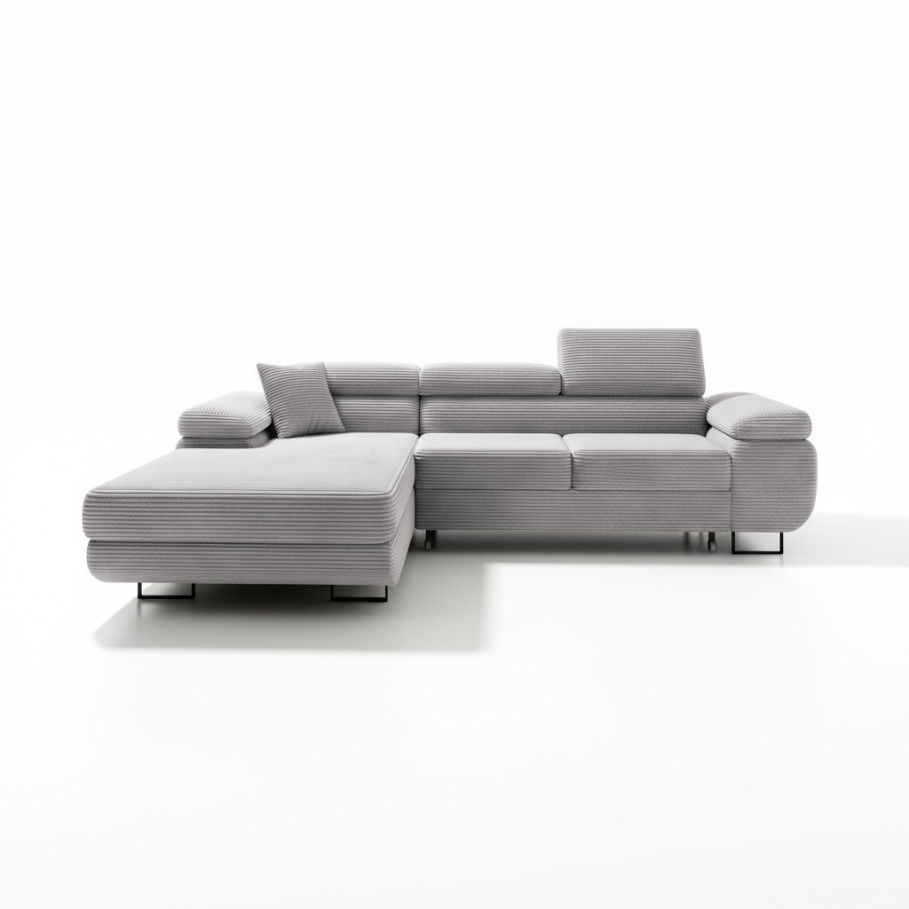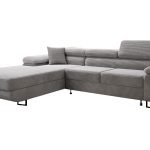 Jego minimalistyczna bryła w kształcie litery L została osadzona na wysokich, czarnych nóżkach. Nadaje to całej konstrukcji wizualnej lekkości. Subtelna szarość obicia wprowadza do wnętrza spokój i elegancję. Dlatego narożnik doskonale odnajdzie się w aranżacjach w stylu loftowym lub skandynawskim. Tapicerowany tył pozwala swobodnie ustawić mebel w dowolnym miejscu salonu. W ten sposób staje się on centralnym punktem domowego życia.