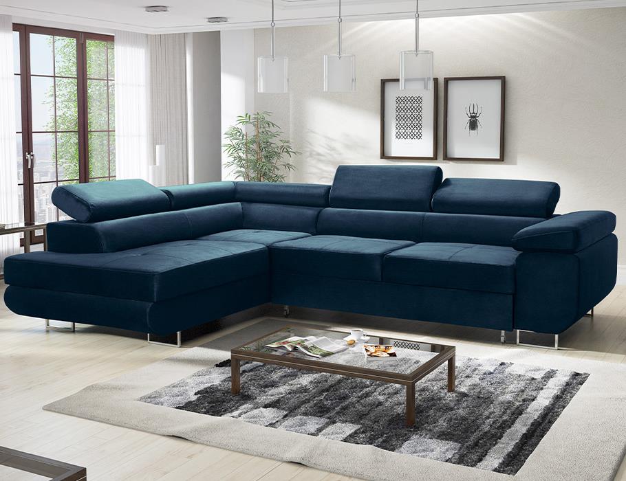 Jego prosty, elegancki design został podkreślony przez wysokie, chromowane nóżki. W ten sposób bryła zyskuje wizualną lekkość i doskonale wpisuje się we współczesne aranżacje. Głęboki, granatowy kolor tapicerki wprowadza do salonu atmosferę spokoju i wyrafinowania. Dzięki temu wnętrze staje się przytulne, a jednocześnie pełne klasy. Narożnik Avesta w kształcie litery L świetnie odnajdzie się zarówno w minimalistycznych, jak i bardziej odważnych przestrzeniach.